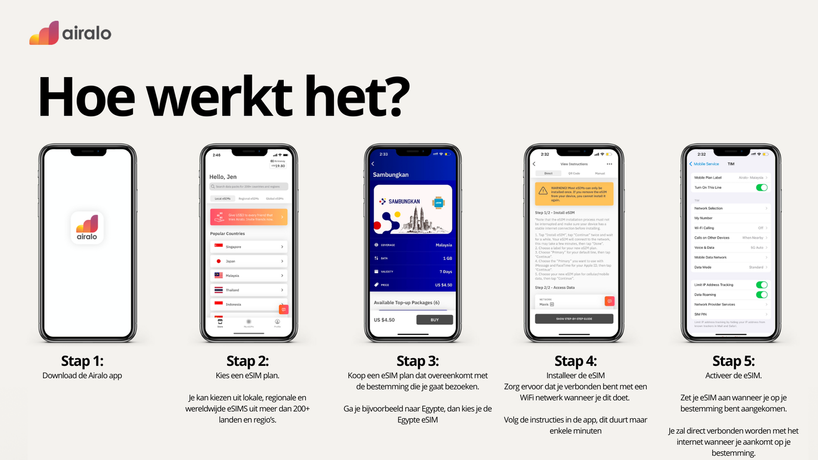 Het aanschaffen van een eSIM bij Airalo werkt ook heel simpel. Download de app, kies een eSIM plan naar jouw keuze, betaal deze en installeer hem op je smartphone. Als je de eSIM thuis al activeert is de kans groot dat hij bij aankomst op je bestemming al direct verbonden wordt met het internet. Mocht je er niet helemaal uitkomen dan kan je ook heel makkelijk contact opnemen met de klantenservice van Airalo. Die helpen je er zo doorheen!