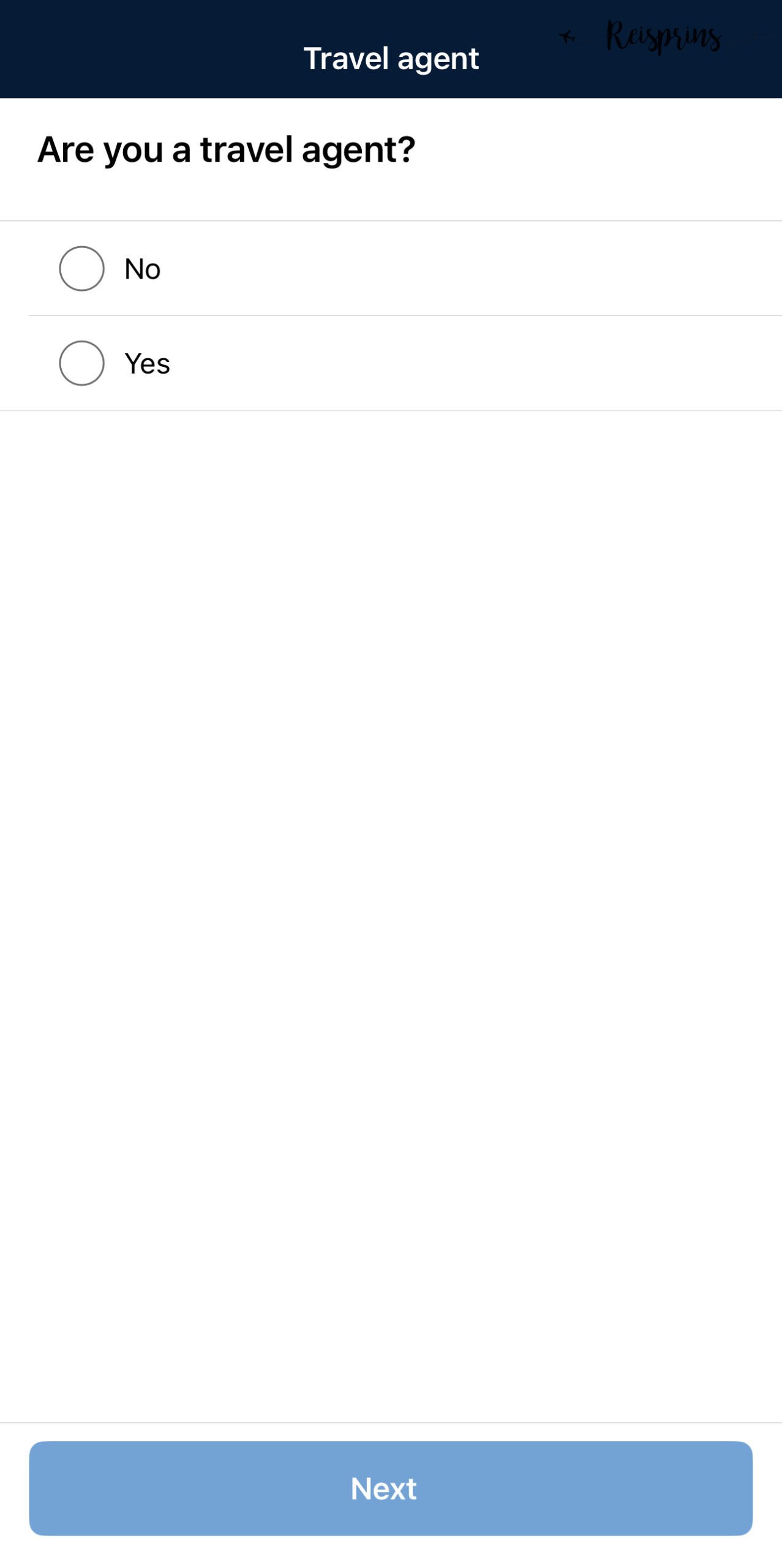 Op het volgende scherm moet je vervolgens de privacy regels accepteren door op Agree te klikken. Hierna kan je er voor kiezen om bij de app gebruik te maken van Face ID of hiervoor een code te gebruiken. Nadat je tweemaal je 6-cijferige code hebt ingevoerd kom je op een scherm met de vraag Are you a travel agent?. Vul hier je antwoord in en klik op Next.
