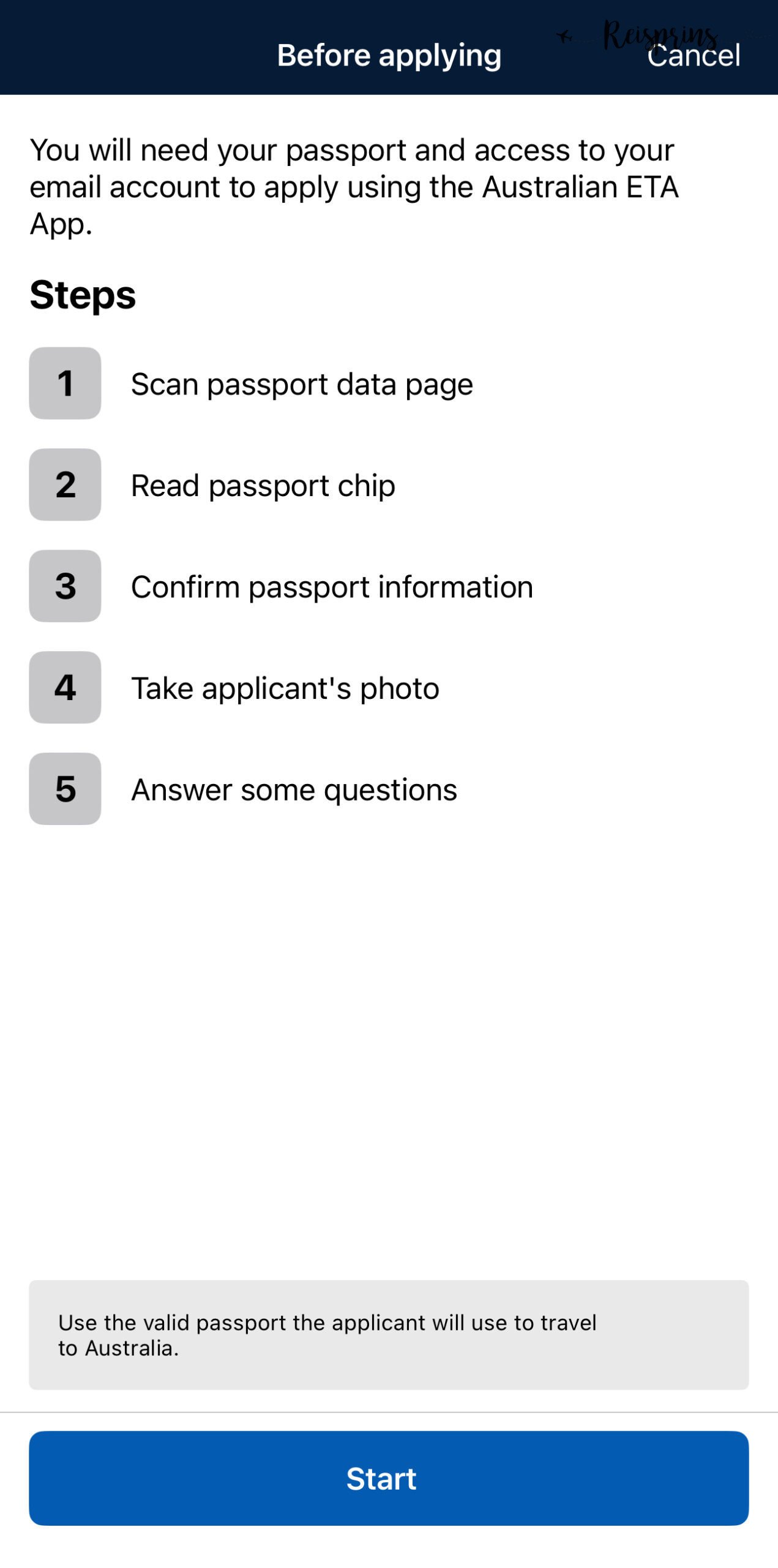 Als je eenmaal de app gedownload hebt op je smartphone kan je aan de slag. In de app wordt je stap voor stap meegenomen door het proces om je ETA voor Australië aan te vragen. Ook krijg je middels afbeeldingen precies te zien wat je allemaal moet doen.