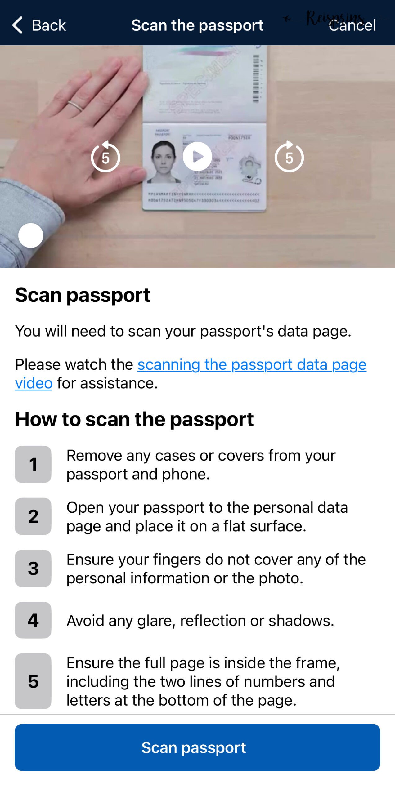 De eerste stap is het scannen van je paspoort. Hiervoor moet je alle hoesjes van je paspoort verwijderen en je paspoort openen op de plastic pagina met je persoonlijke informatie. Zorg ervoor dat je vingers niet afdekken en probeer enige glans, reflecties of schaduwen te vermijden. Zorg er vervolgens voor dat de hele pagina precies binnen het frame past inclusief de lijnen met nummers en letters onderaan de pagina. Als je vervolgens op Scan passport klikt kom je in het scherm terecht waarmee je een foto kan maken van deze paspoortpagina.