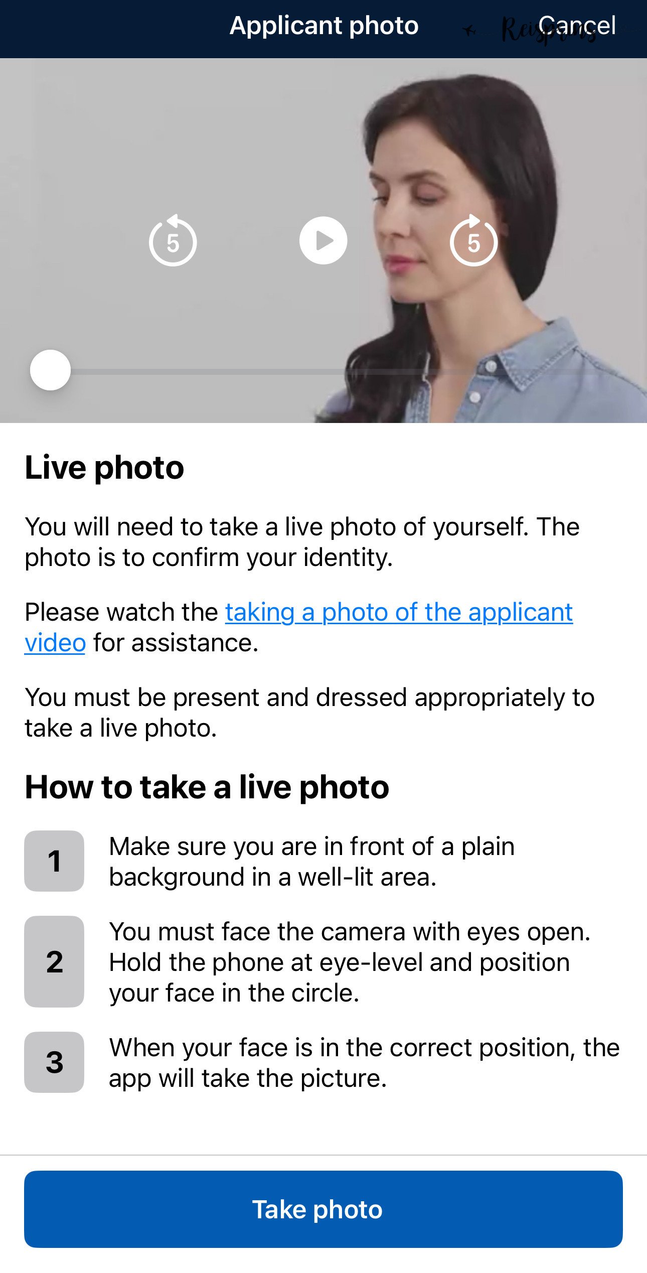Naast een foto van je paspoort is het nu tijd om ook een foto van jezelf te maken. Ga hiervoor tegen een lege muur staan met voldoende licht. Klik op de knop Take photo en kijk met open ogen in de camera en zorg ervoor dat je gezicht precies in de daarvoor bestemde cirkel terecht komt. Als je gezicht in de juiste positie is neemt de app vervolgens zelf automatisch een foto.