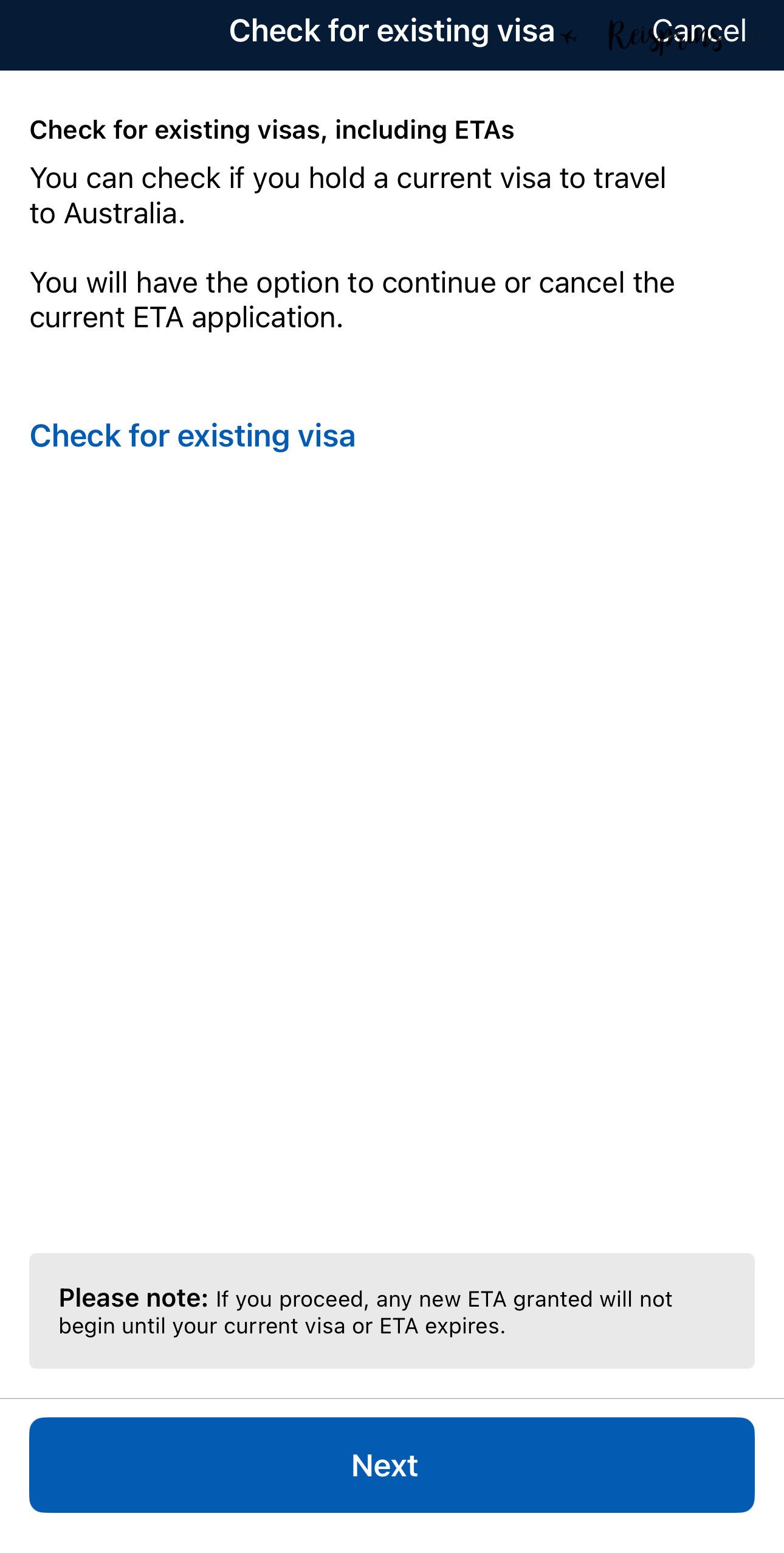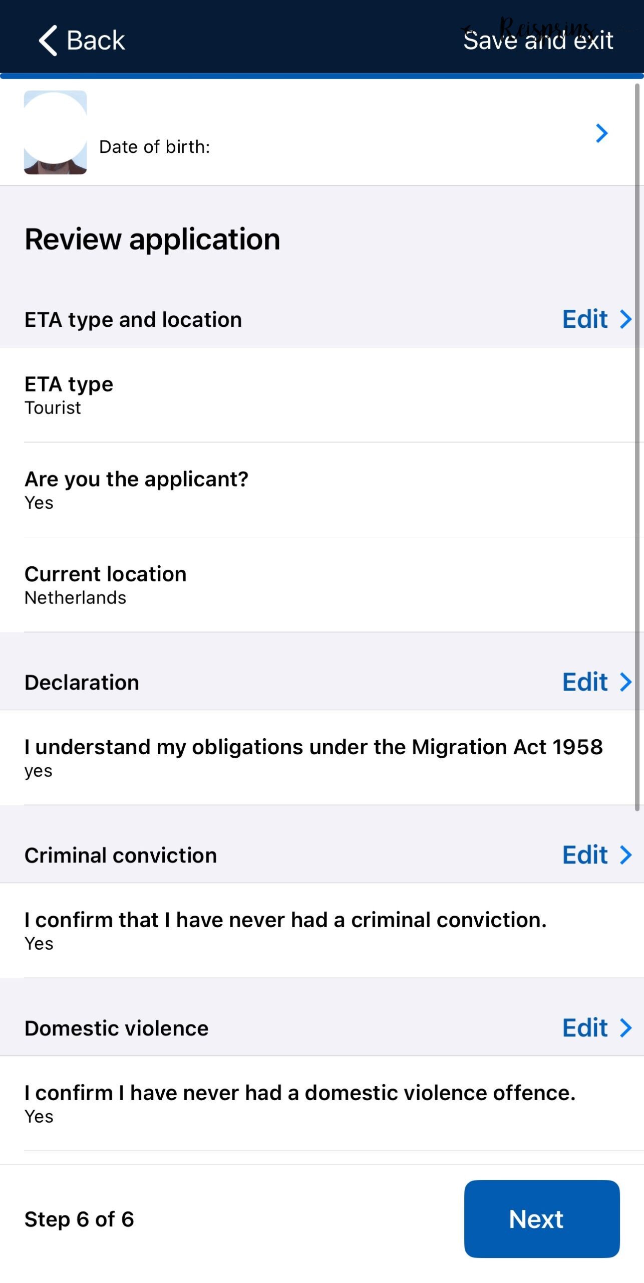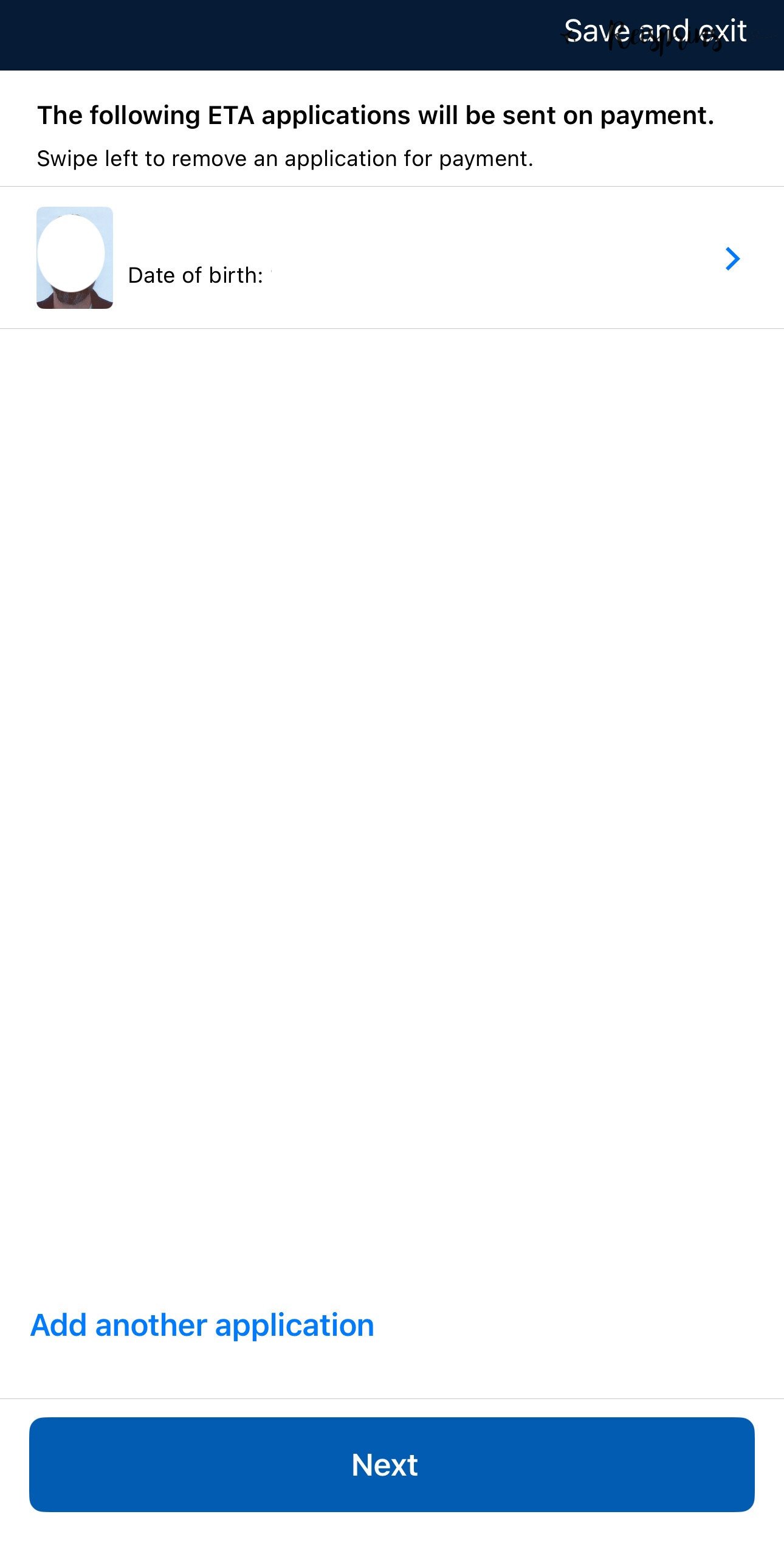 Wil je naast je persoonlijke aanvraag ook een ETA voor Australië aanvragen voor een van je medereizigers dan kan je dat hier doen door op Add another application te klikken. Hiermee moet je alle stappen nogmaals doorlopen voor de andere persoon. Wanneer alle aanvragen zijn ingevuld klik je op Next in de grote blauwe knop onderaan je scherm.