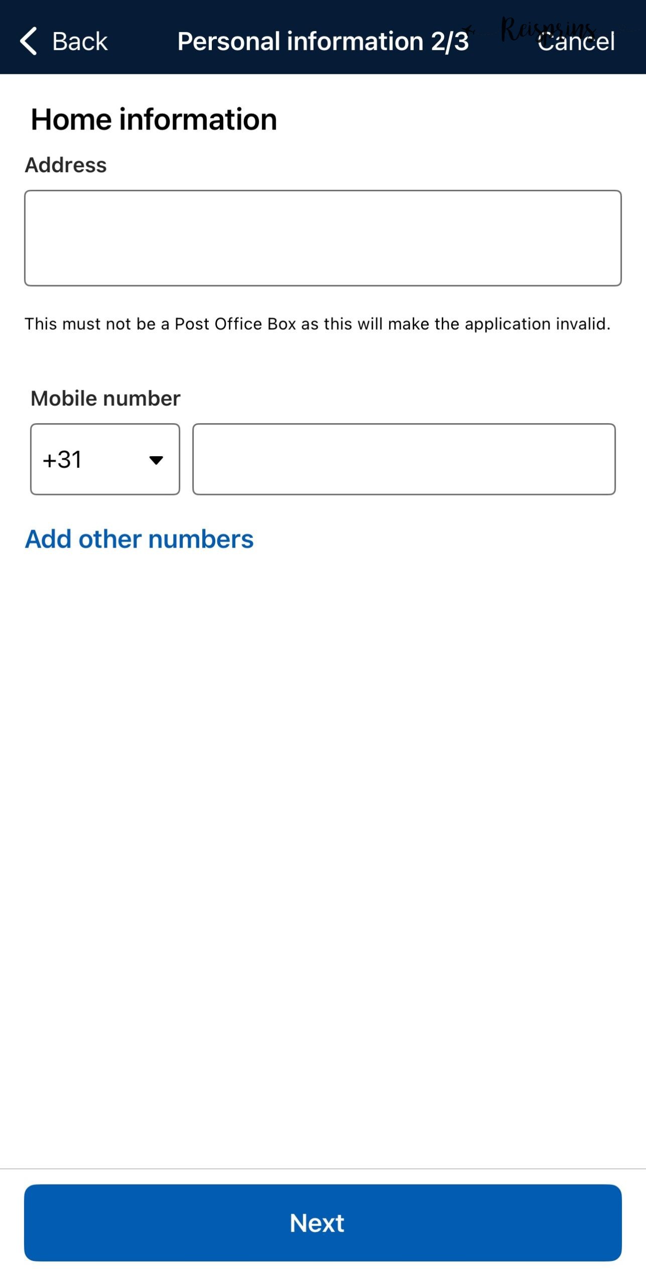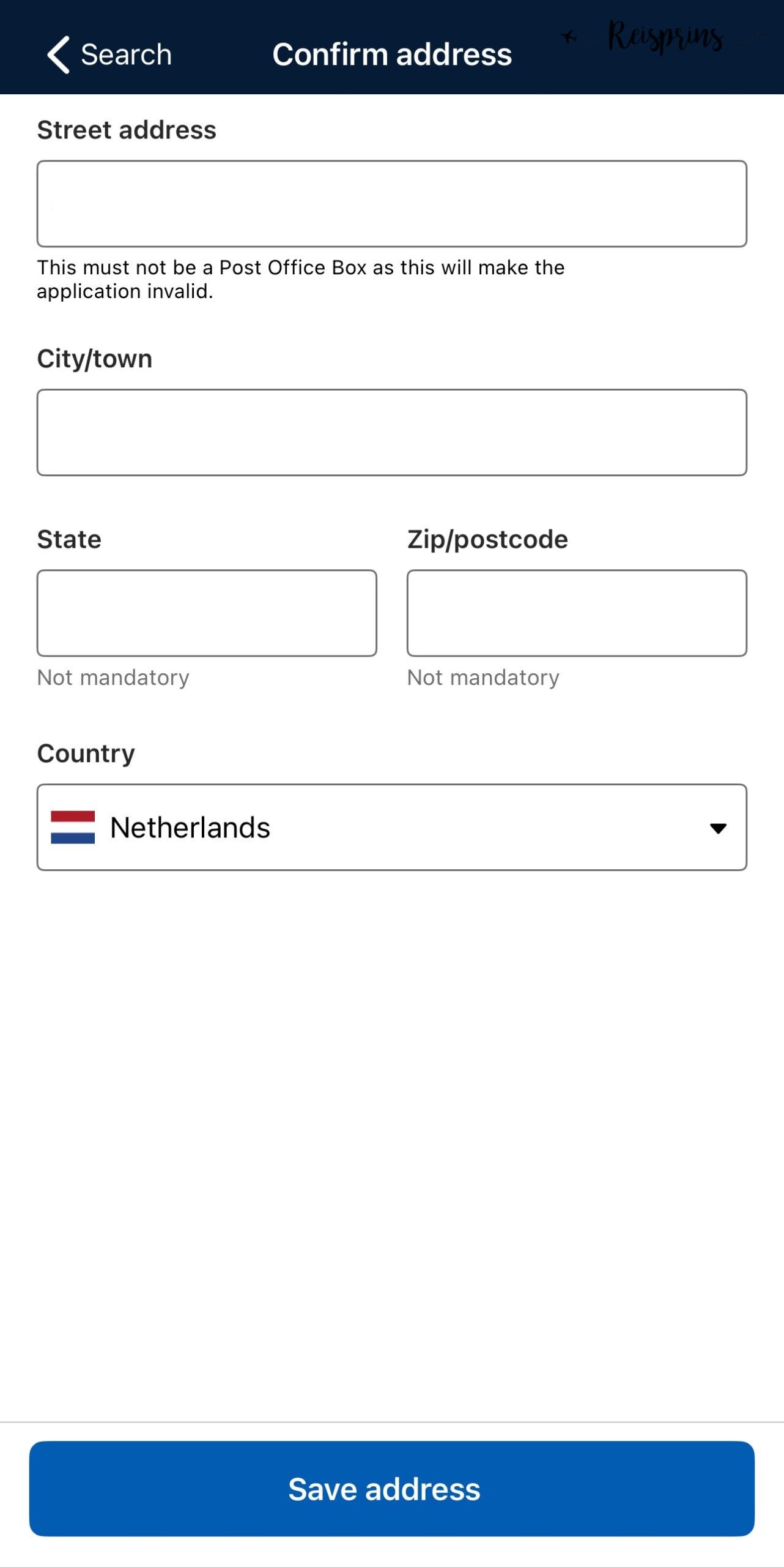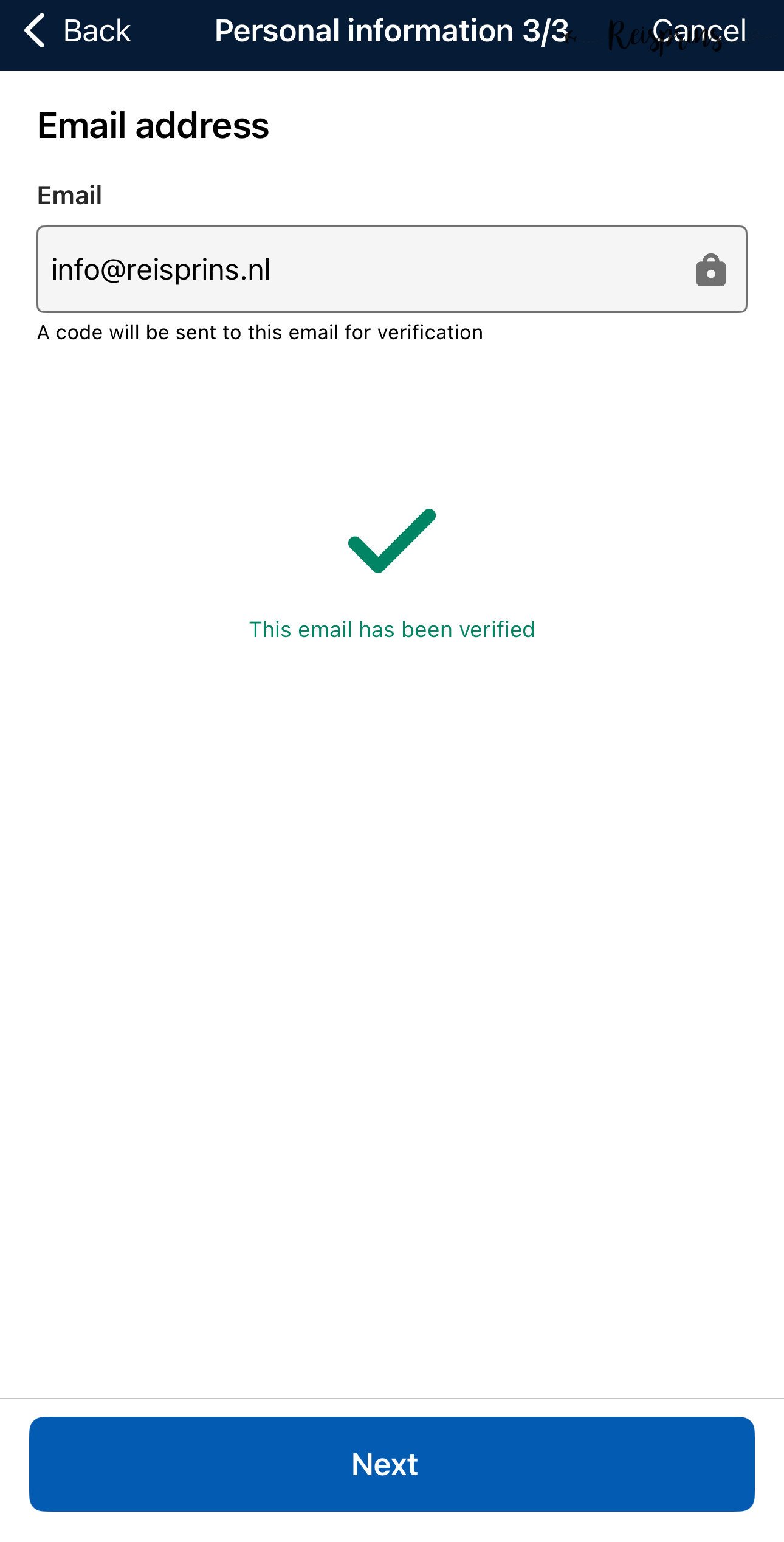 Op de volgende pagina zie je vervolgens bij Address je adresgegevens staan zoals je deze eerder hebt ingevoerd en kan je ook je telefoonnummer nog invoeren. Ook hier klik je weer op de blauwe knop met Next. Tenslotte vul je ook je e-mailadres nog in. Het is belangrijk dat dit juist wordt gedaan, want hier zal je ook je ETA en bevestiging op ontvangen. Als je deze juist hebt ingevoerd druk je op Verify email.