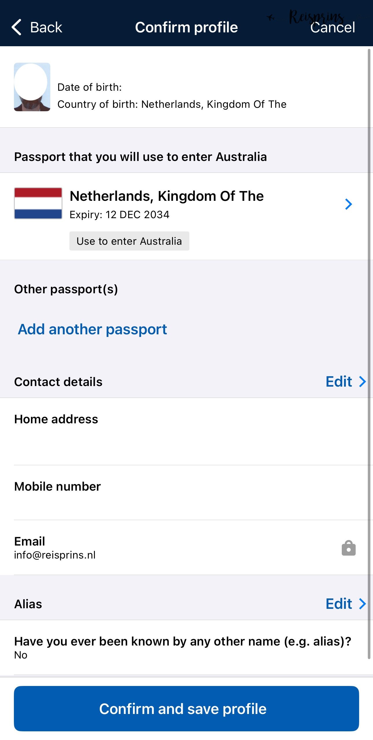 Bij de volgende stap kan je nog een laatste keer alle gegevens controleren die je eerder hebt ingevoerd. Dit betreft zowel de informatie van je paspoort, je foto als je adres, telefoonnummer en e-mail adres. Als dit allemaal juist is druk je op Confirm and save profile.