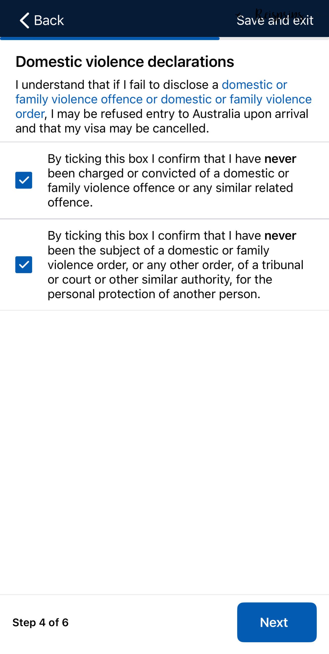 In het volgende scherm vink je het vakje aan waarmee je aangeeft dat je geen andere visum voor Australië hebt en klik je wederom op Next. Daarna vink je het vakje aan waarmee je aangeeft dat je nog nooit veroordeeld bent voor een strafrechtelijk feit en klik je weer op Next. Hierna moet je twee vakjes aanvinken waarmee je aangeeft dat je nog nooit als dader of slachtoffer betrokken bent geweest bij huiselijk geweld en klik je weer op Next.