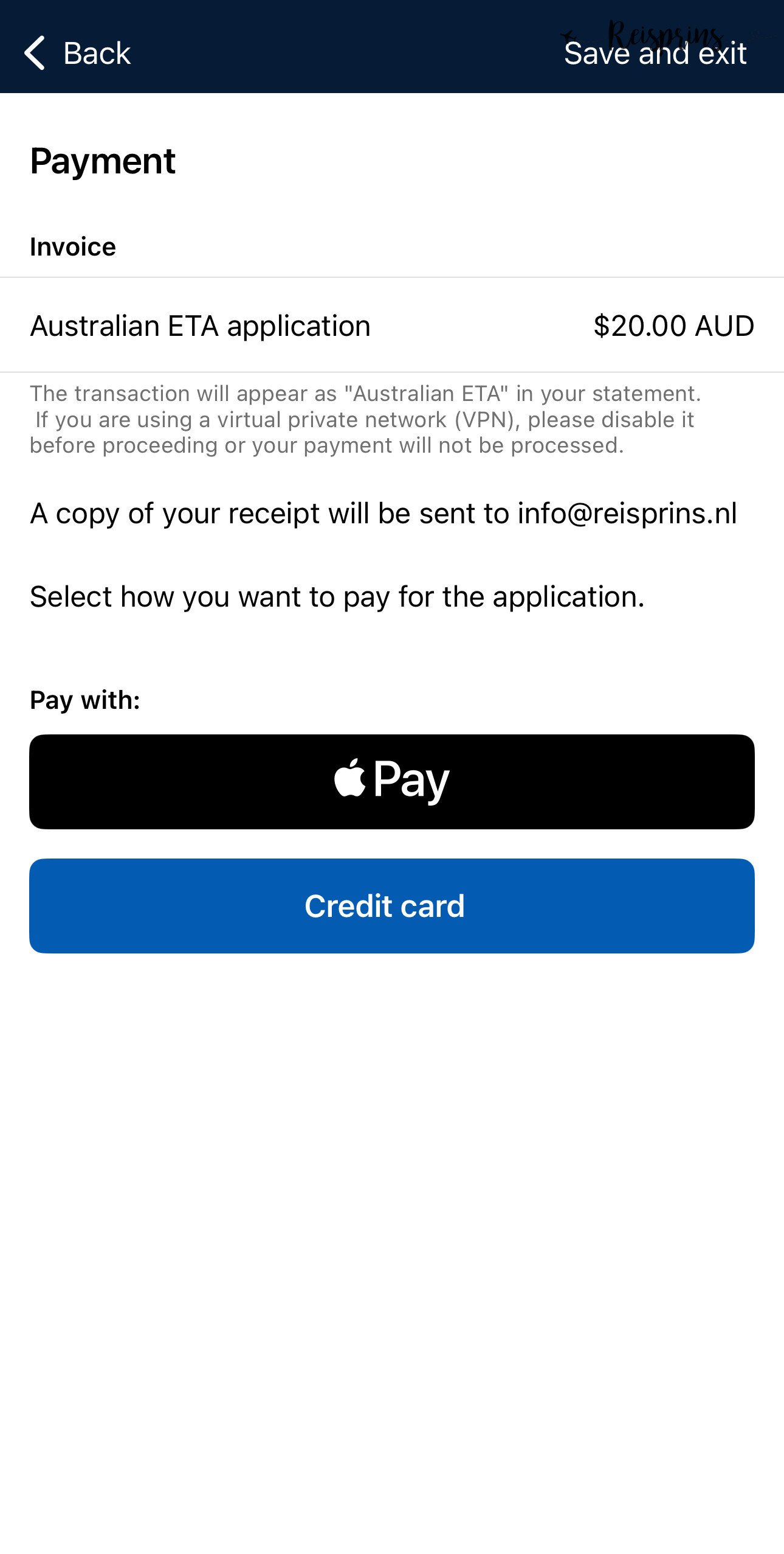 Nu is het tijd om te gaan betalen. De kosten zijn AUD$ 20 per persoon en dat zal zichtbaar zijn op dit scherm. Je kan betalen met Apple Pay (als je een iPhone gebruikt), GooglePay (als je een android toestel gebruikt) of met je Credit card. Kies jouw favoriete optie en als de betaling is voltooid ben je eindelijk klaar!