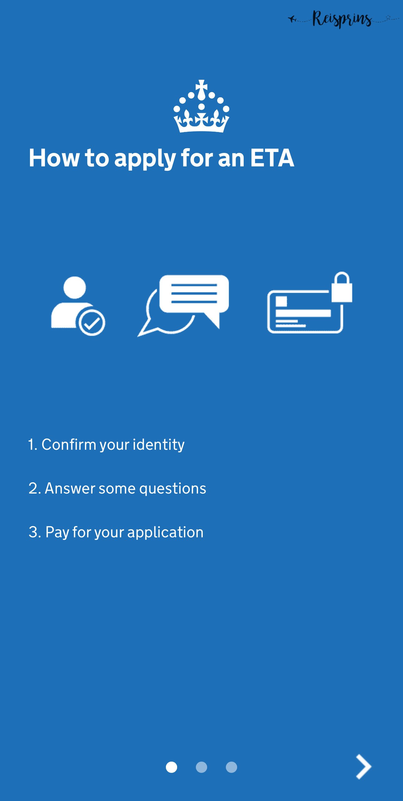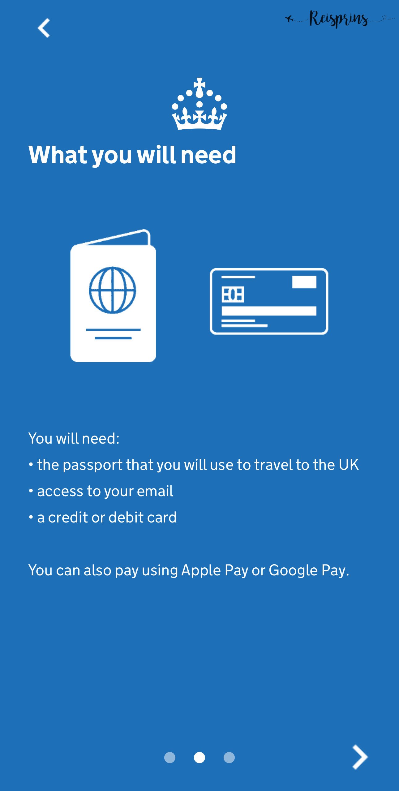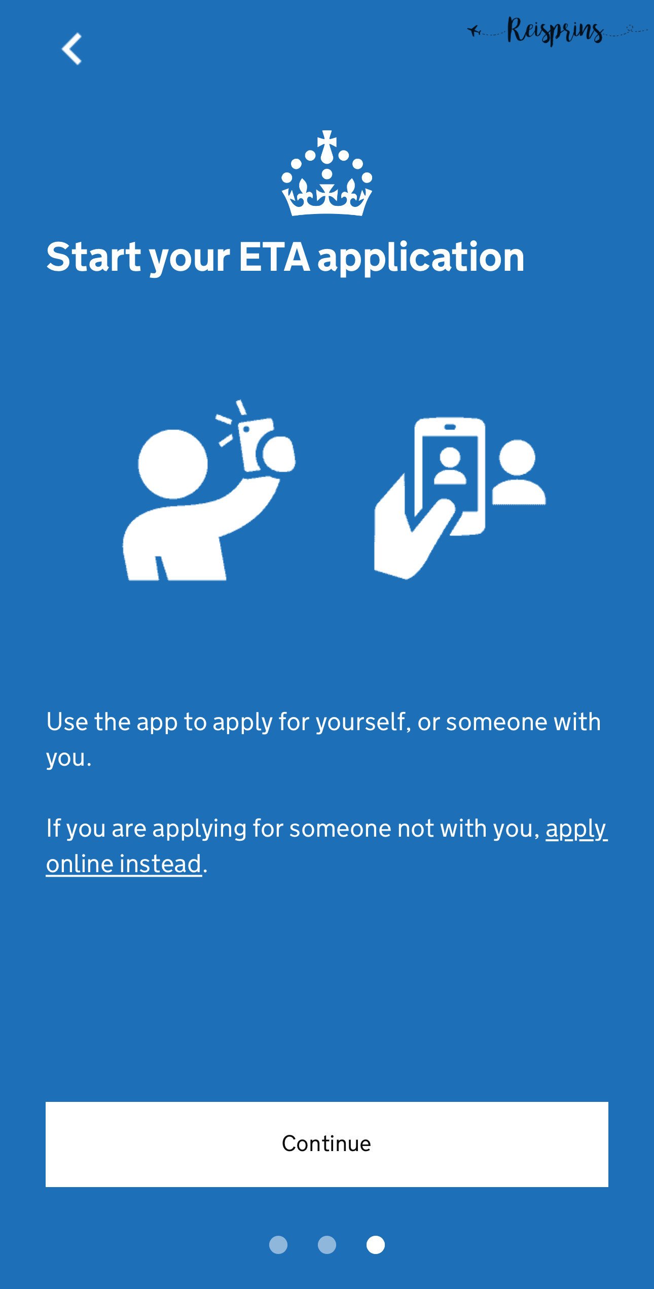 Zorg dus dat je de UK ETA App hebt gedownload. Als je de de app hebt geopend kom je eerst in 3 schermen terecht waar je doorheen moet lopen. Deze schermen geven aan wat er gaat gebeuren. Zo moet je je identiteit bevestigen, een aantal vragen beantwoorden en betalen voor je aanvraag. Je hebt een geldig paspoort nodig, een e-mailadres en een creditcard. Ook kan je gebruik maken van Apple Pay of Google Pay. Tenslotte wordt er aangegeven dat je ook een ETA kan aanvragen voor iemand die bij je is. Klik hierna op Continue.