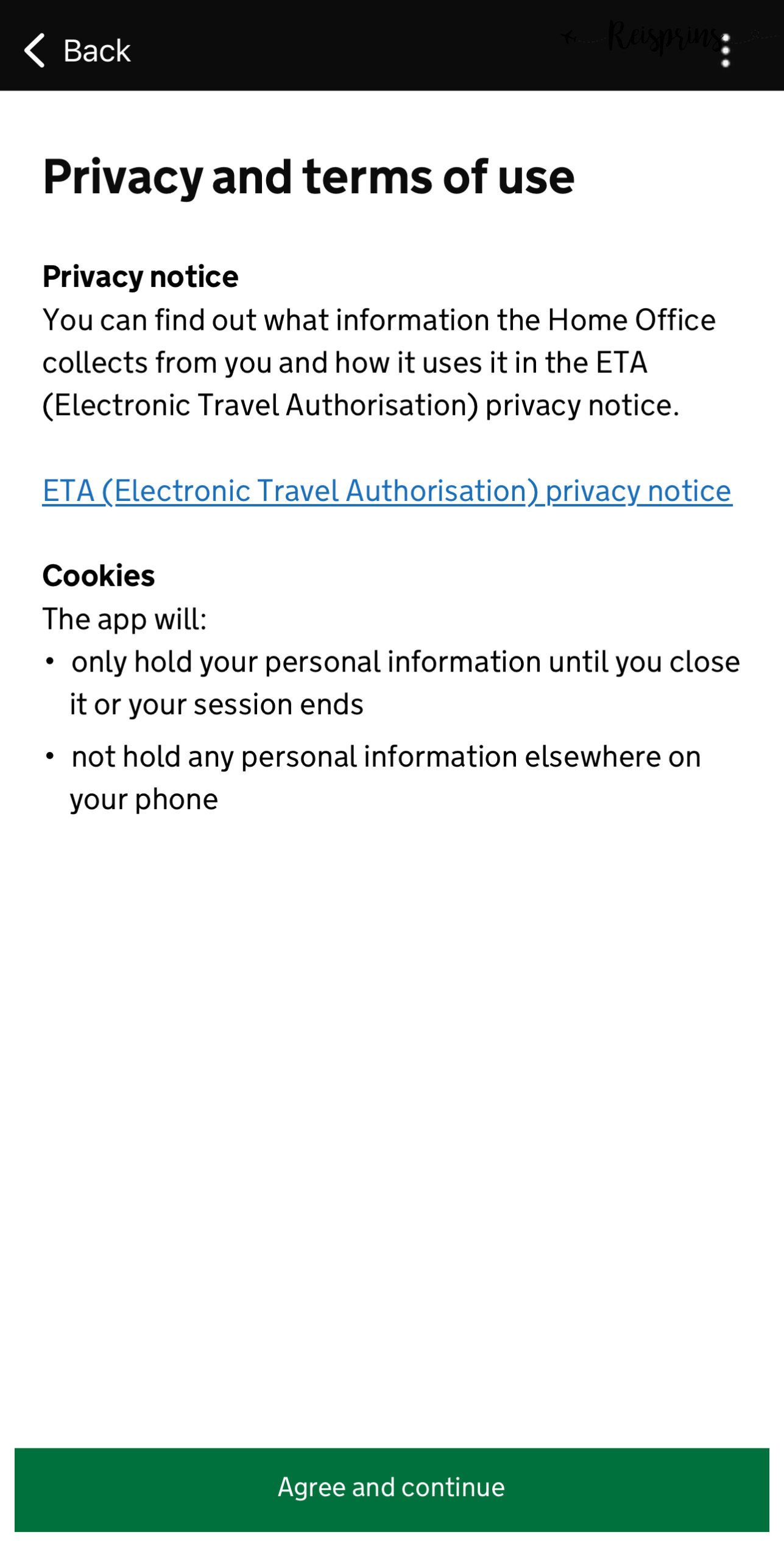 Hierna wordt duidelijk gemaakt waarom je een ETA moet aanvragen, hoe lang deze geldig is wat de kosten zijn. Ook wordt duidelijk gemaakt dat je sessie automatisch wordt afgesloten als je 30 minuten lang niets doet. Hierna zal je dus helemaal opnieuw moeten beginnen. Klik vervolgens op Start now. In de volgende stap accepteer je de privacy regels door op de groene knop met Agree and continue te klikken.