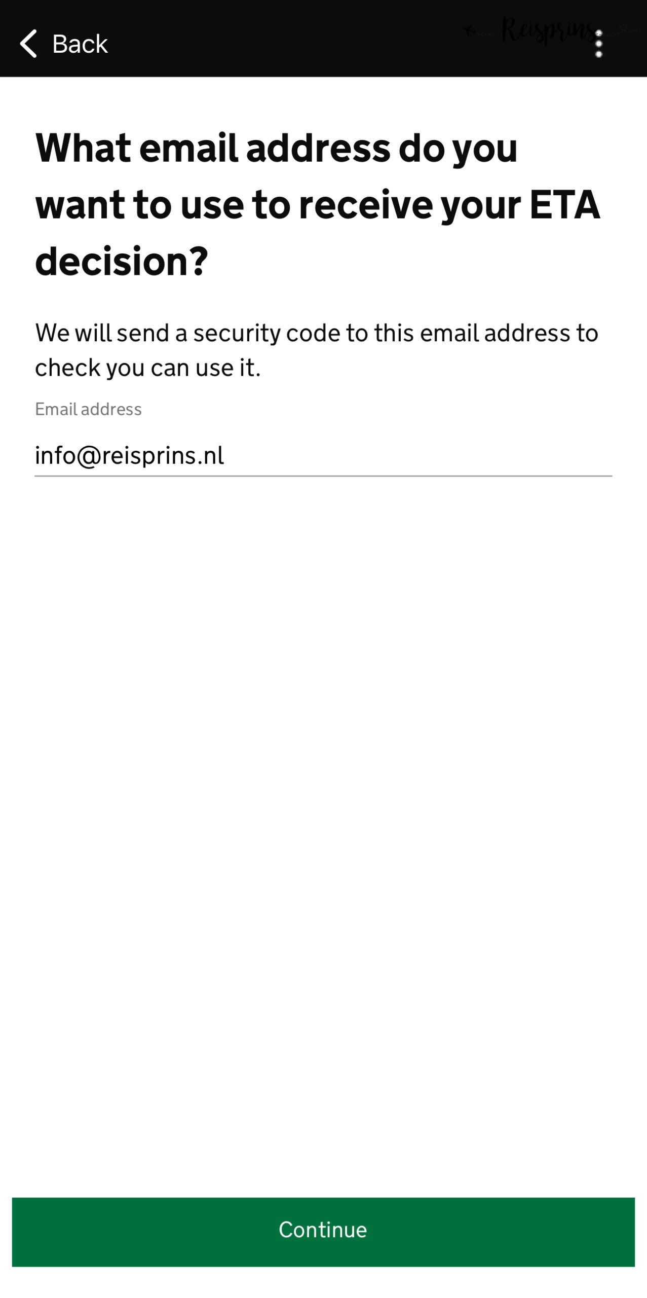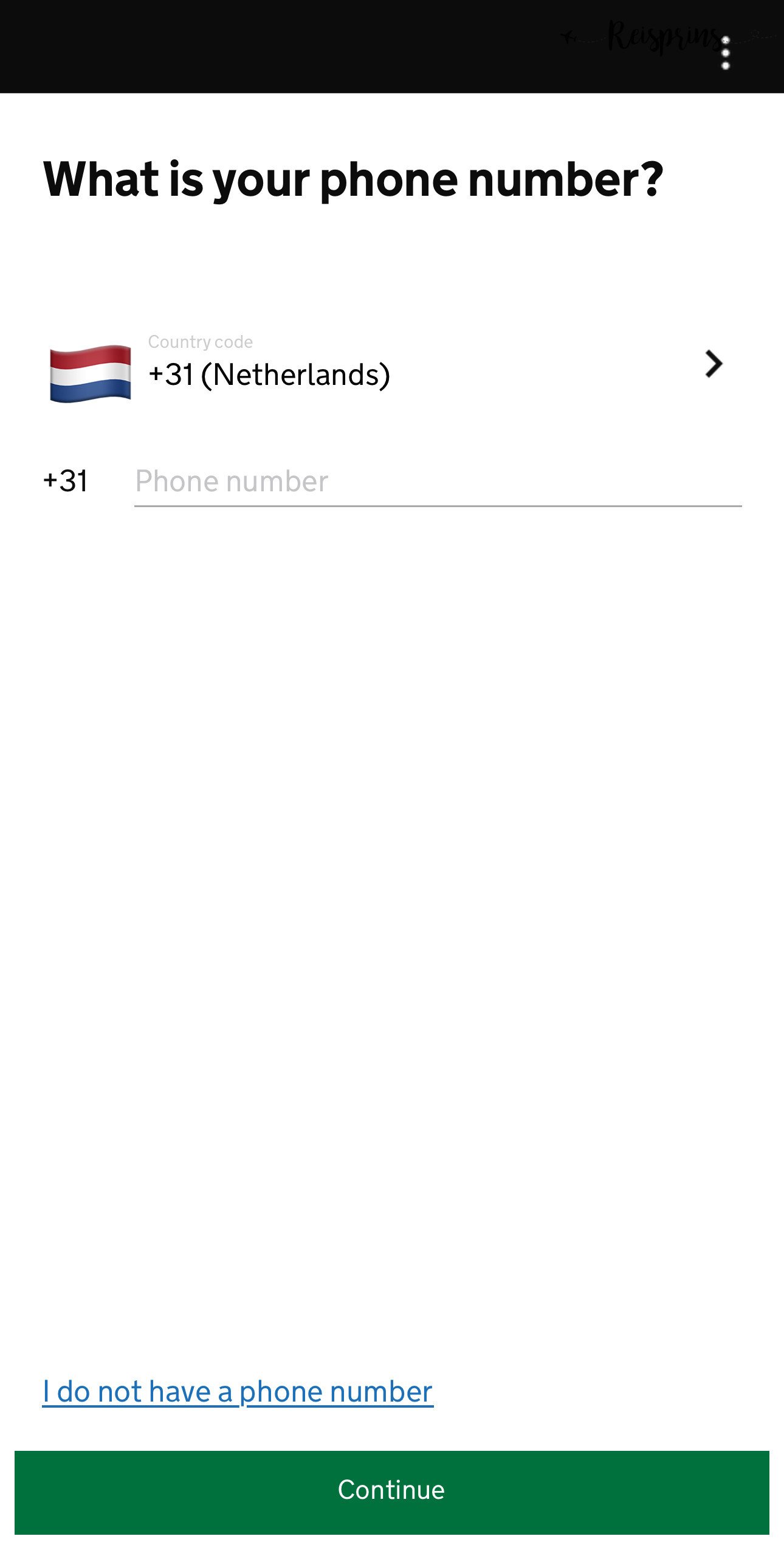 Dan is het tijd om je e-mailadres in te voeren. Het is van belang dat deze juist is ingevoerd, aangezien je hier je ETA op zal ontvangen. Vul deze dus zorgvuldig in en klik op de groene knop met Continue. Aansluitend vul je ook je telefoonnummer in. Geef daarbij eerst aan uit welk land je komt en vul vervolgens je telefoonnummer in voordat je weer op de groene Continue knop drukt.