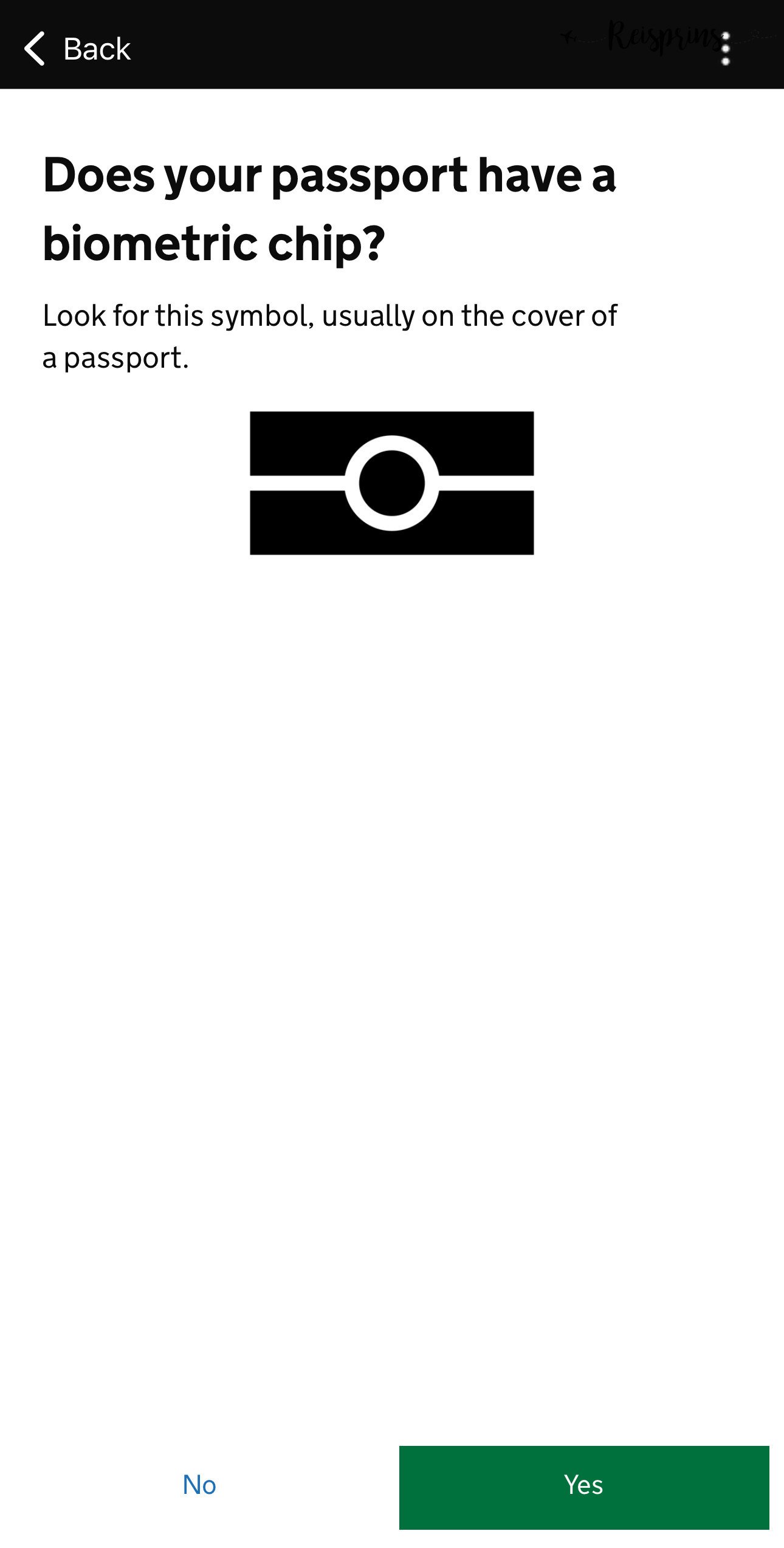 Eerst moet je middels de groene Yes knop aangeven of je paspoort een zogenaamde biometric chip heeft. Dit kan je heel eenvoudig herkennen aan het logo dat op de afbeelding hieronder staat aangegeven. Als dit logo zichtbaar is op de voorste pagina van je paspoort dan heb je deze chip.