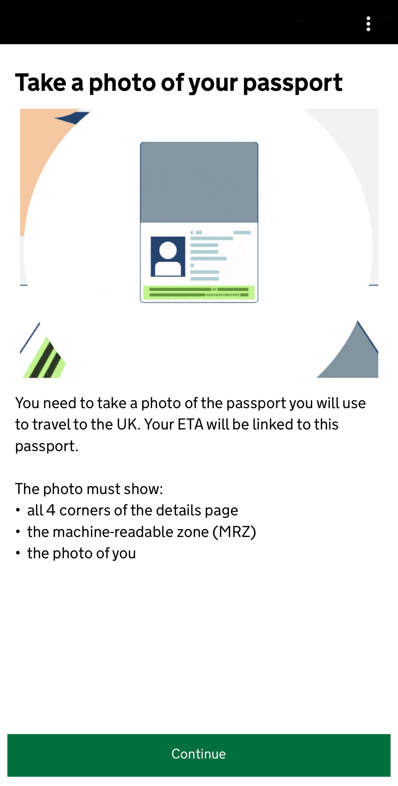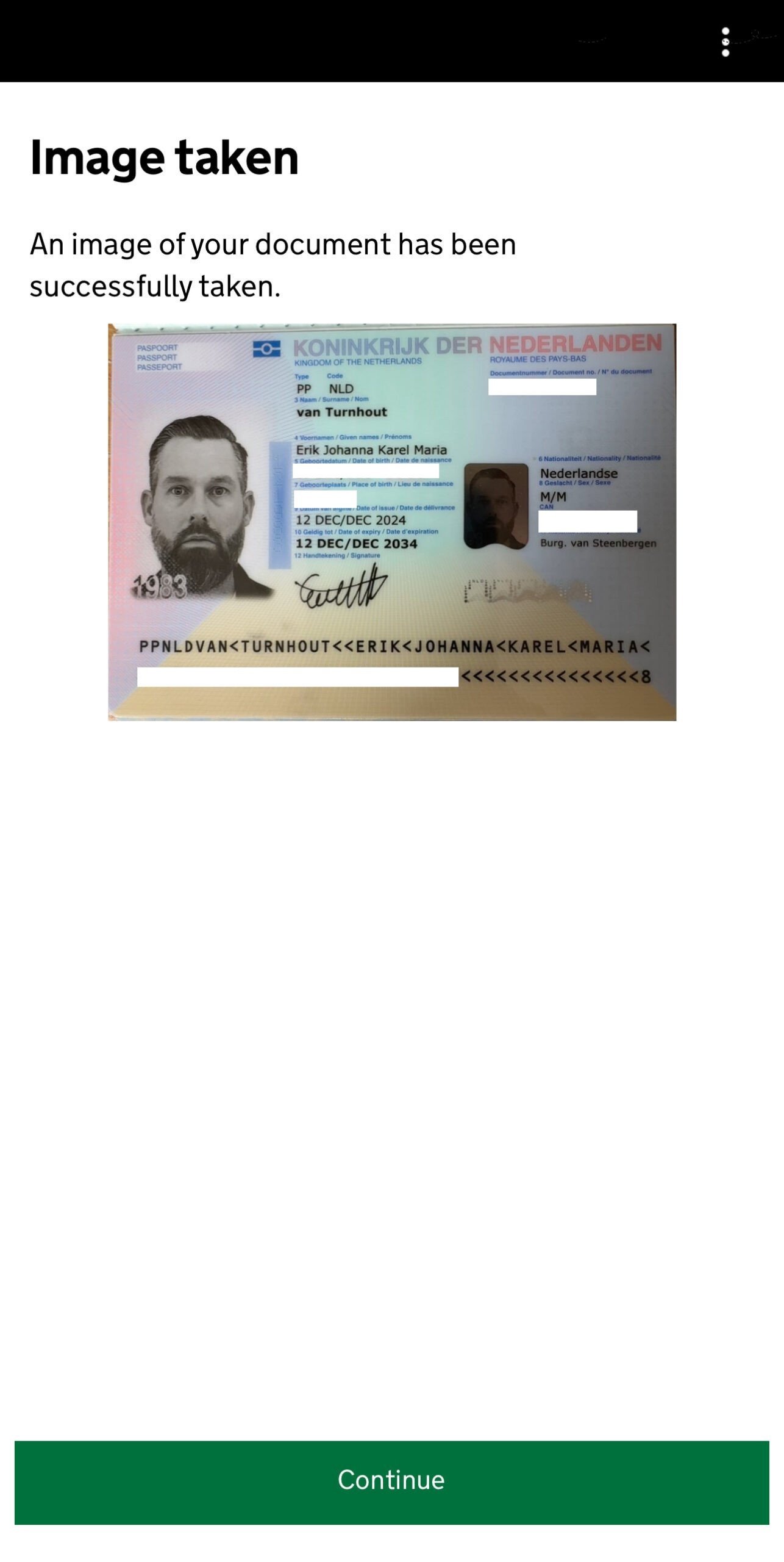 Eerst ga je echter een foto maken van je paspoort. Je hoeft daarvoor alleen op de groen knop Continue te drukken en vervolgens zal je camera geactiveerd worden. Vervolgens moet je er voor zorgen dat de informatiepagina van je paspoort mooi in het getoonde vak valt. Als dit het geval is wordt automatisch de foto genomen. Nadat je de foto hebt genomen krijg je de gemaakt foto te zien. Als deze correct is kan je op de groene Continue drukken.