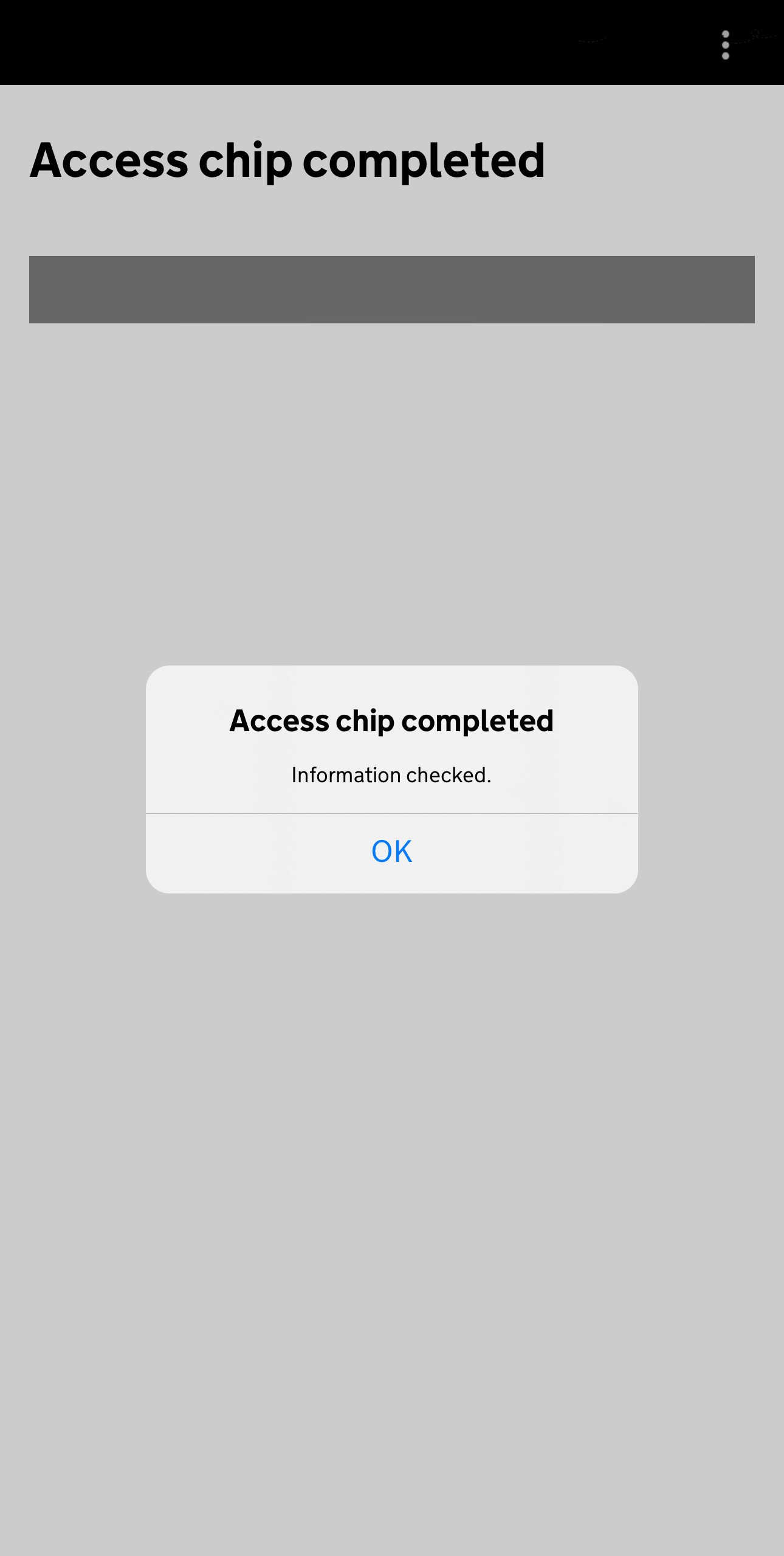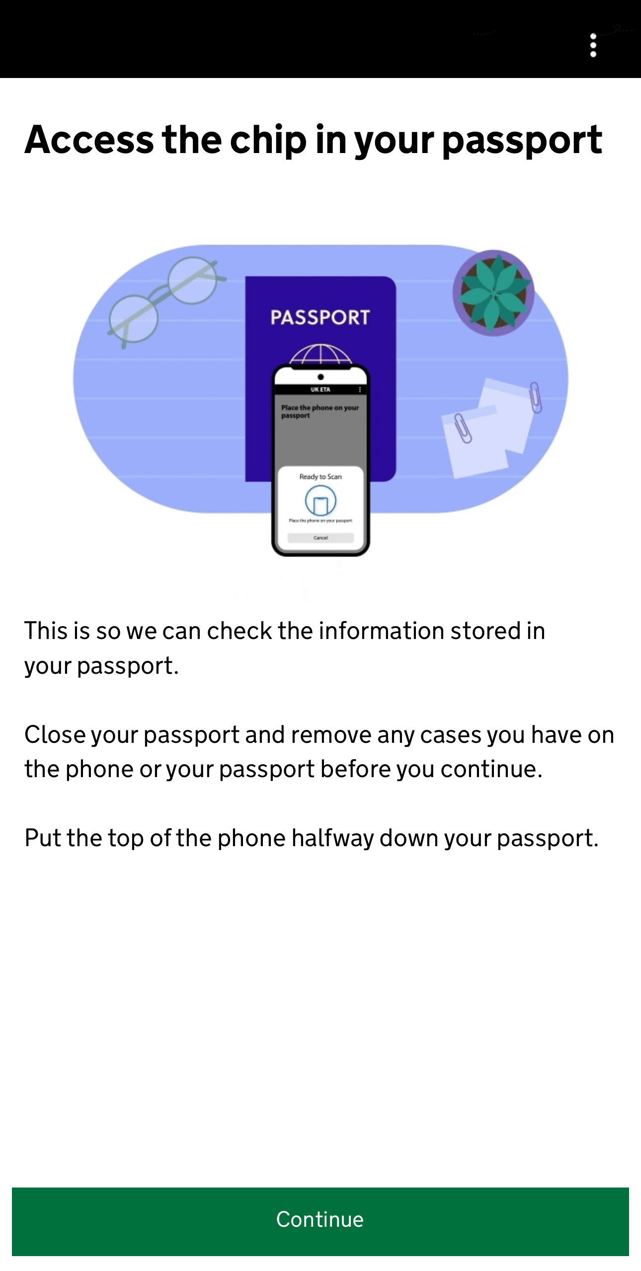 Dan is het tijd om gebruik te maken van de chip in je paspoort. Wat je eigenlijk moet doen is je smartphone bovenop je paspoort leggen maar de bovenste helft van je paspoort nog zichtbaar houden. Als je vervolgens op de groen Continue knop drukt zal je zien dat je smartphone de chip gaat scannen en de informatie eruit zal halen. Als je de melding Access chip completed ziet is de scan compleet en kan je op OK drukken.
