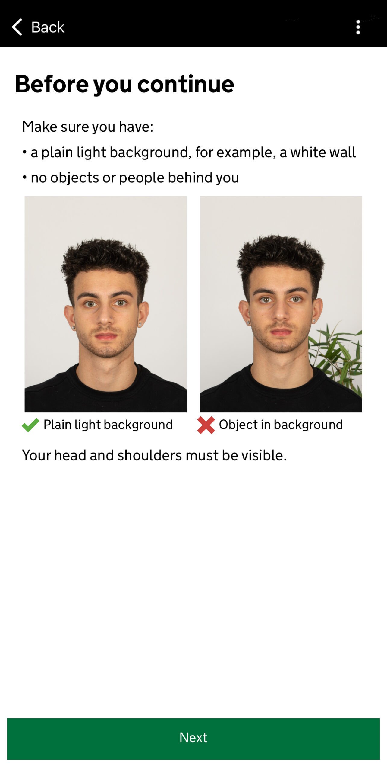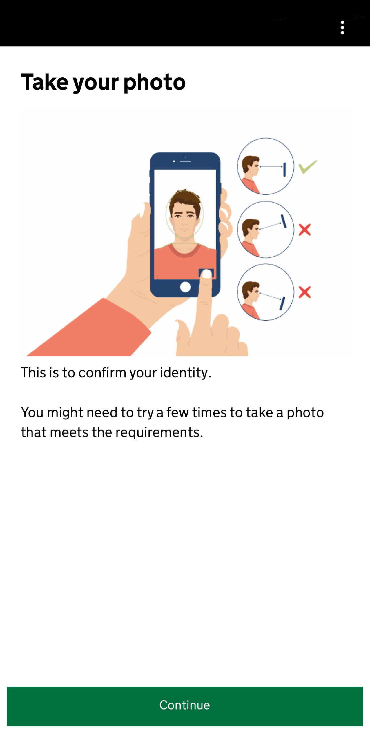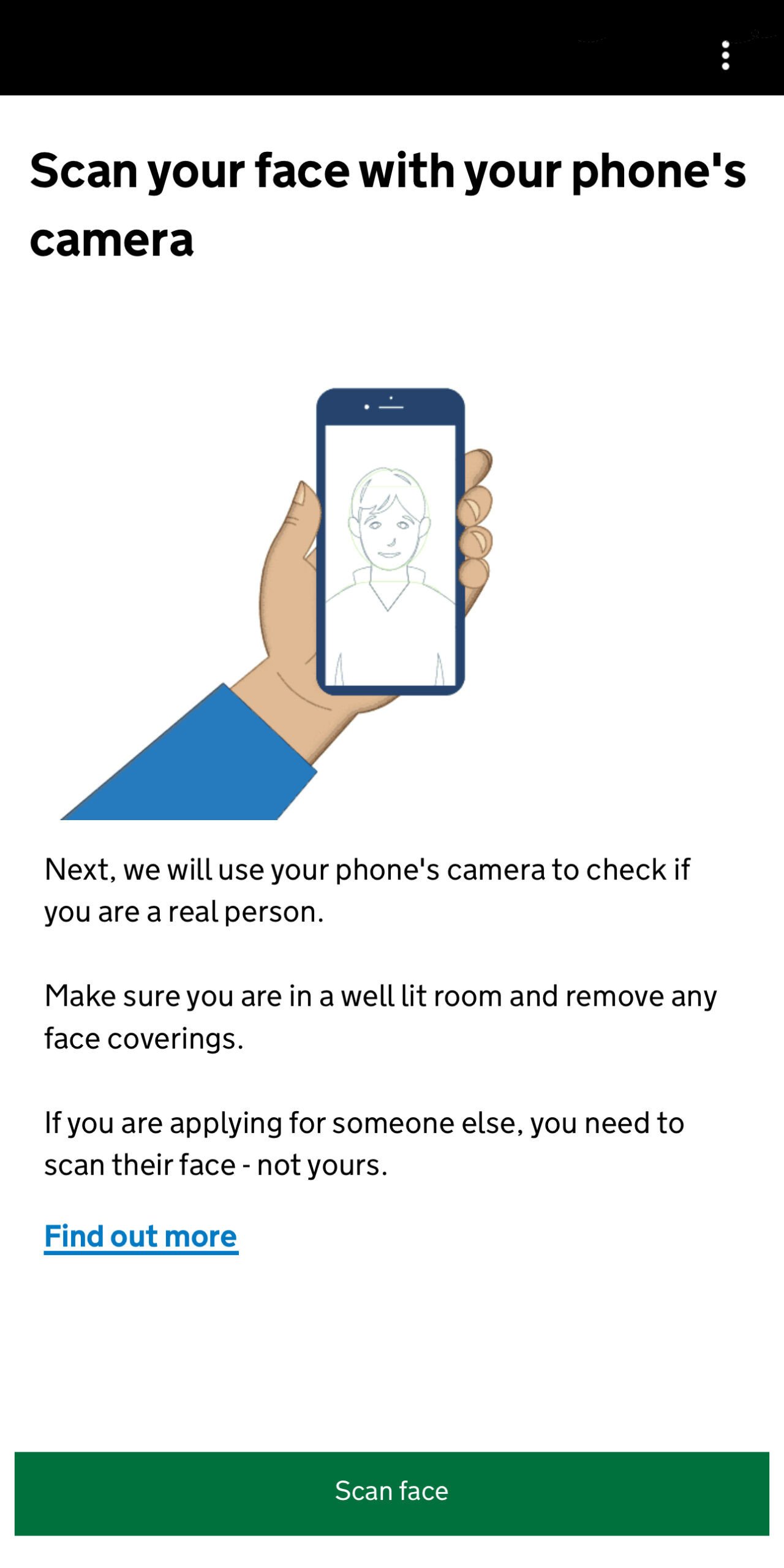 Dan wordt het hoog tijd om een foto van jezelf te gaan maken. Eerst krijg je een check waarbij je gezicht gescand wordt. Deze scan bekijkt je gezicht van verschillende kanten en controleert daarmee of je wel een echt persoon bent. Je hoeft hiervoor alle gezichtsbedekkingen verwijderen en in een goed verlichte ruimte de camera voor je gezicht te houden nadat je op Scan face hebt gedrukt.