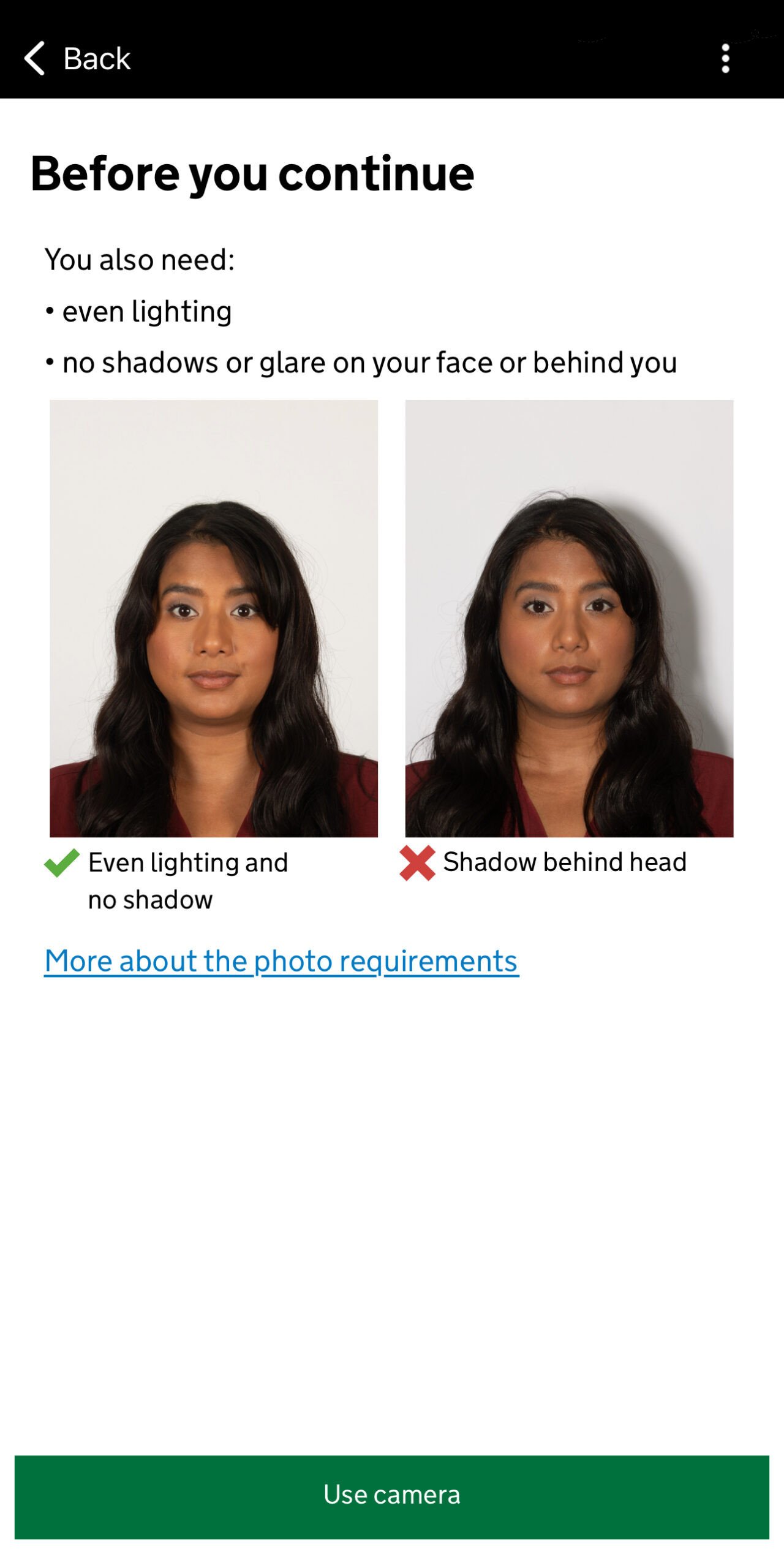 Als dit is gelukt moet je ook een foto van jezelf nemen. Ook dit gebeurt middels de app. Deze foto is nodig om je identiteit te bevestigen. Je moet de camera recht voor je gezicht houden en vervolgens op Continue drukken. Hierna wordt er aangegeven dat het belangrijk is dat je bijvoorkeur tegen een lichte muur gaat staan waar verder geen andere personen of objecten zichtbaar zijn. Doe dit en klik op Next. Bekijk ook goed of alles goed verlicht is en er geen schaduwvorming is. Je kan deze foto dus het beste bij daglicht maken. Als dit allemaal in orde is druk je op Use camera.