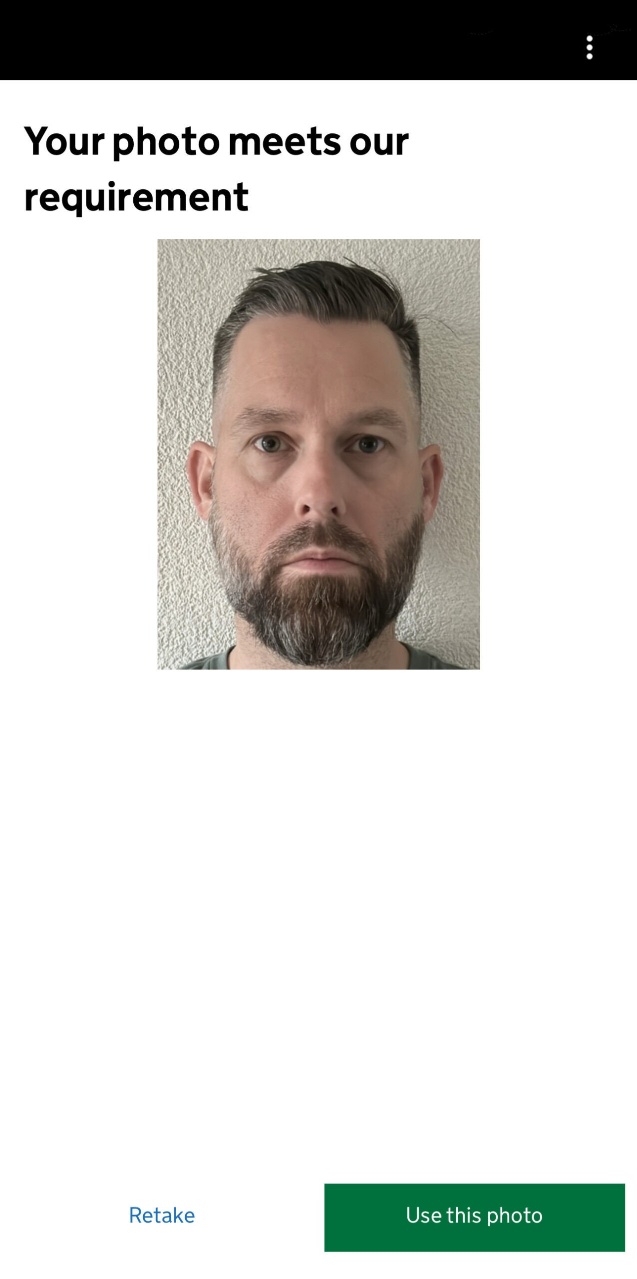 Hierna maak je volgens de voorgeschreven regels de foto. Als de foto goed gelukt is krijg je in het volgende scherm de tekst Your photo meets our requirement te zien en kan je op Use this photo drukken. Mocht de foto niet goed zijn dan kan je via Retake opnieuw een poging wagen.
