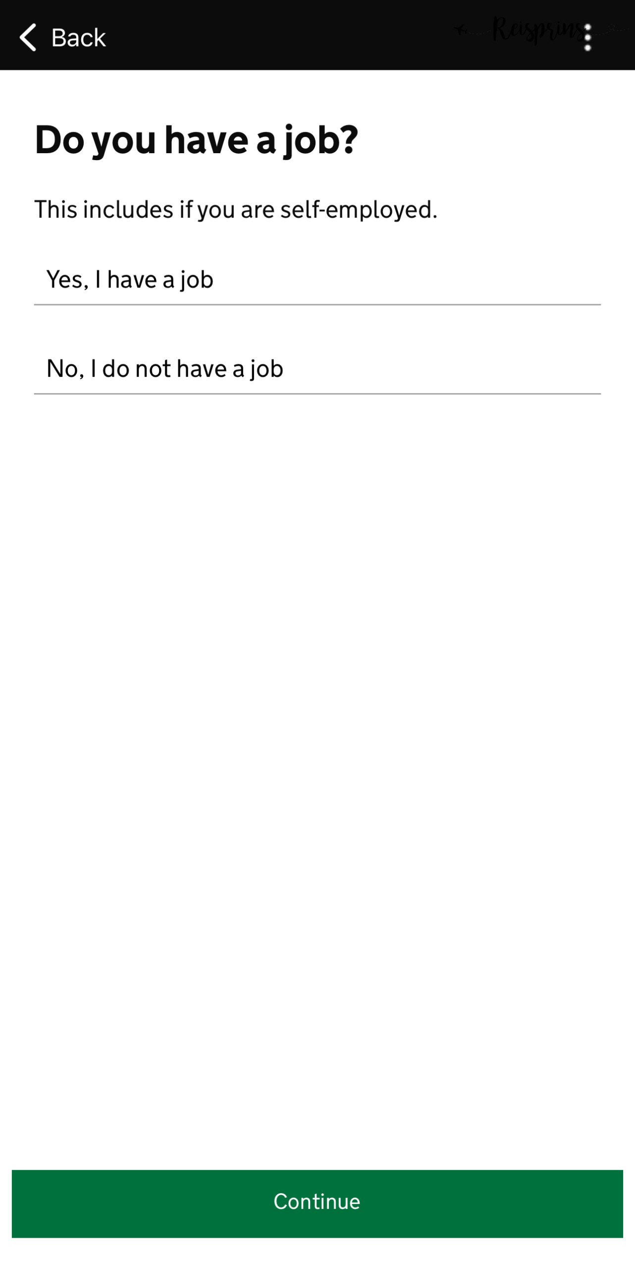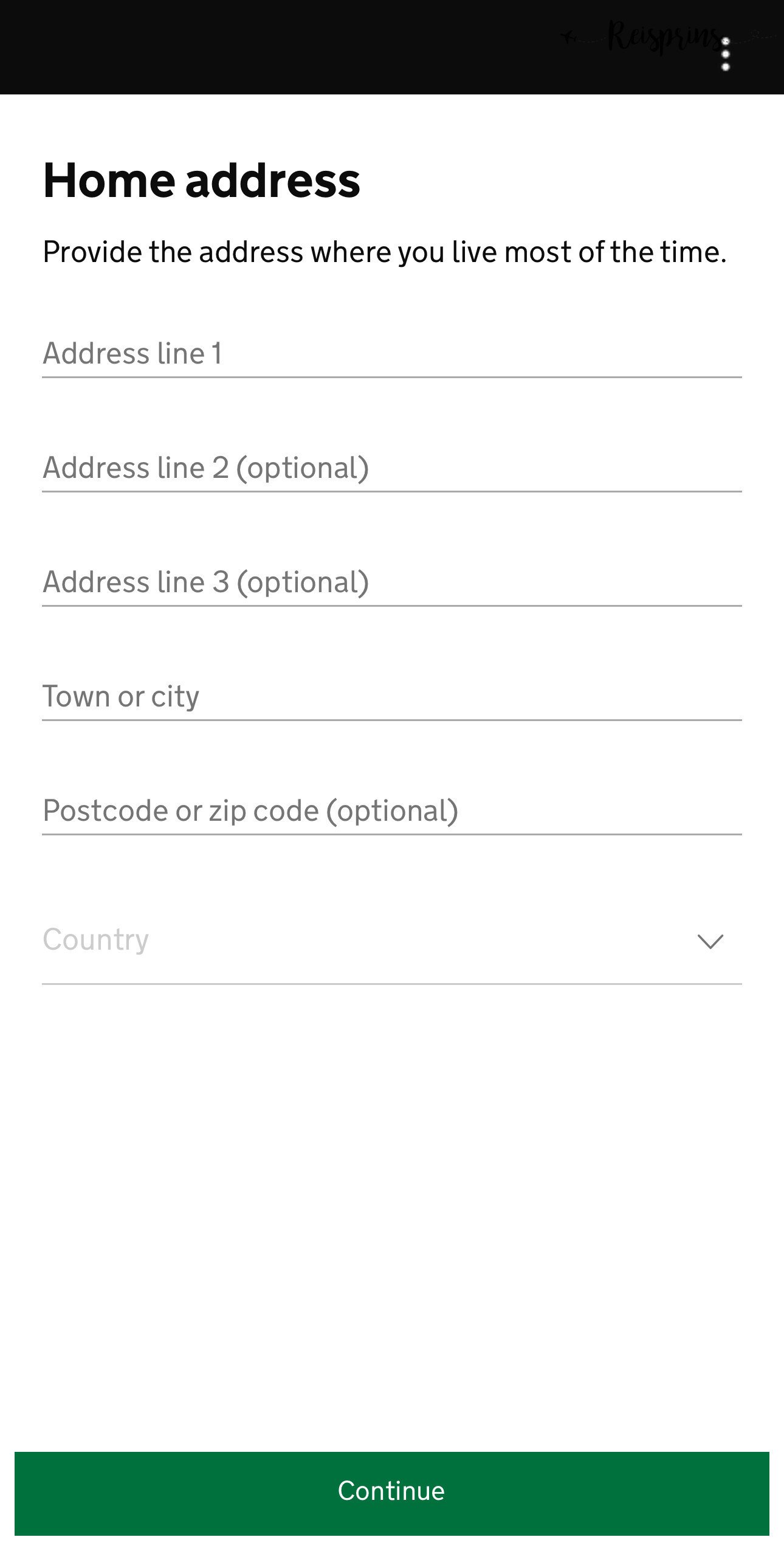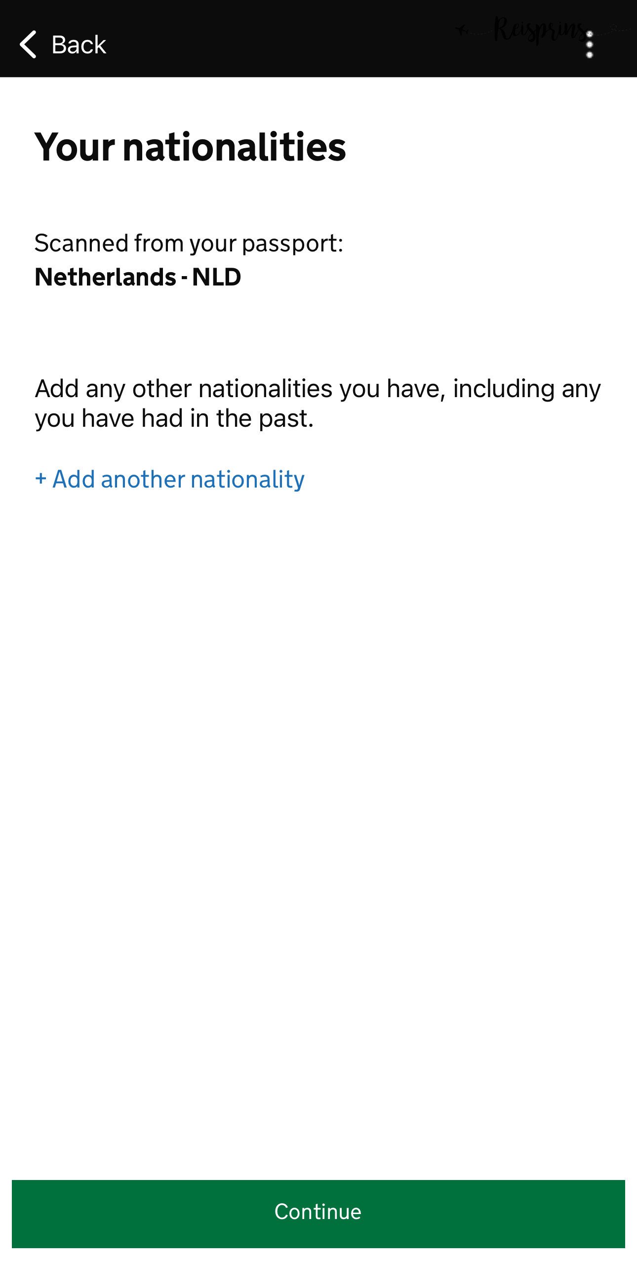 Daarna moet je in het scherm je adresgegevens invullen. Dus je straat, woonplaats, postcode en land. Hierna klik je op Continue. Dan geeft de app de nationaliteit aan die in je paspoort is gescand. Mocht je meerdere nationaliteiten hebben dan kan je die hier toevoegen via +Add another nationality of druk je direct op Continue. In het volgende scherm moet je aangeven of je een baan hebt en daarna op Continue drukken.