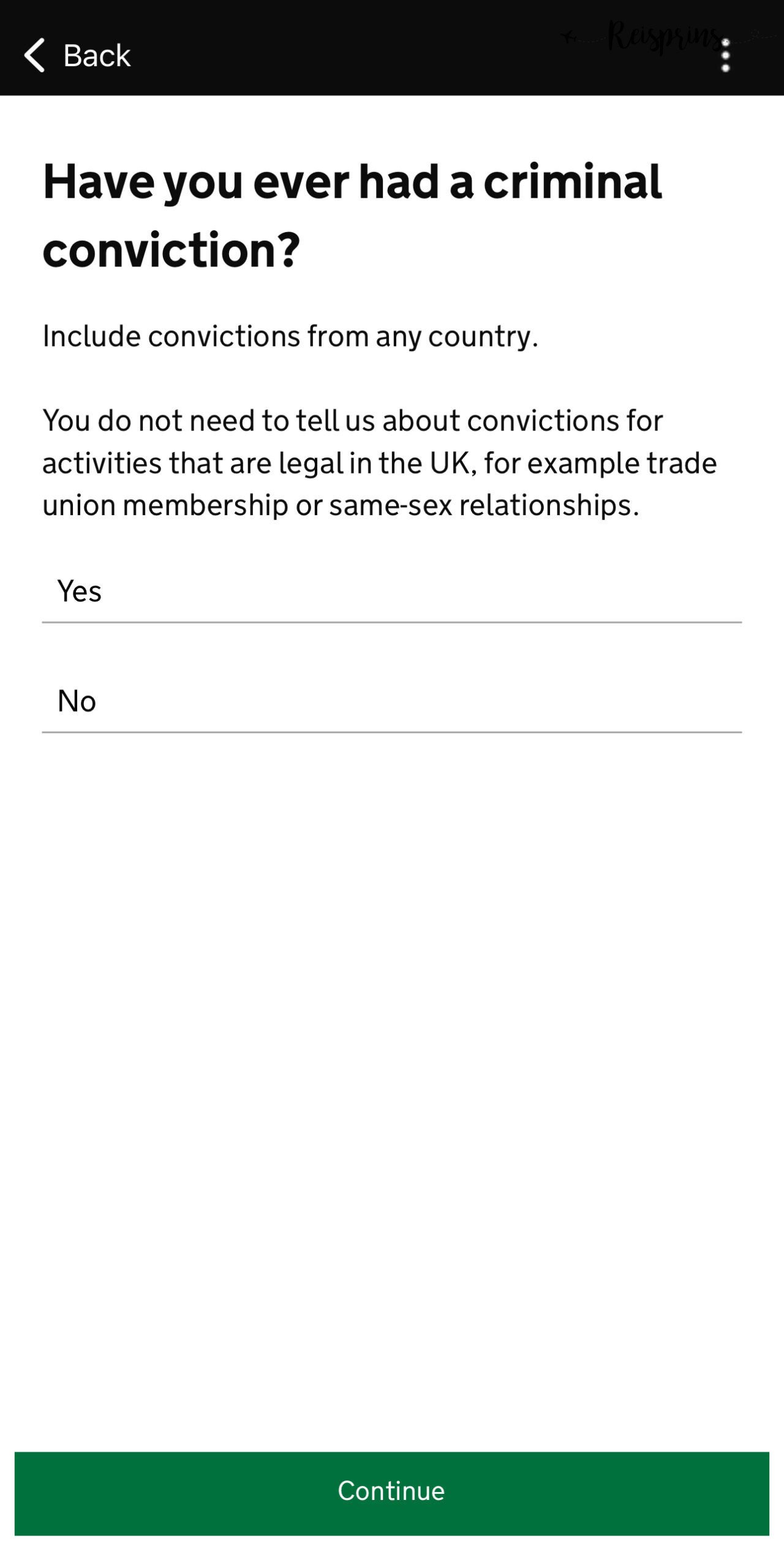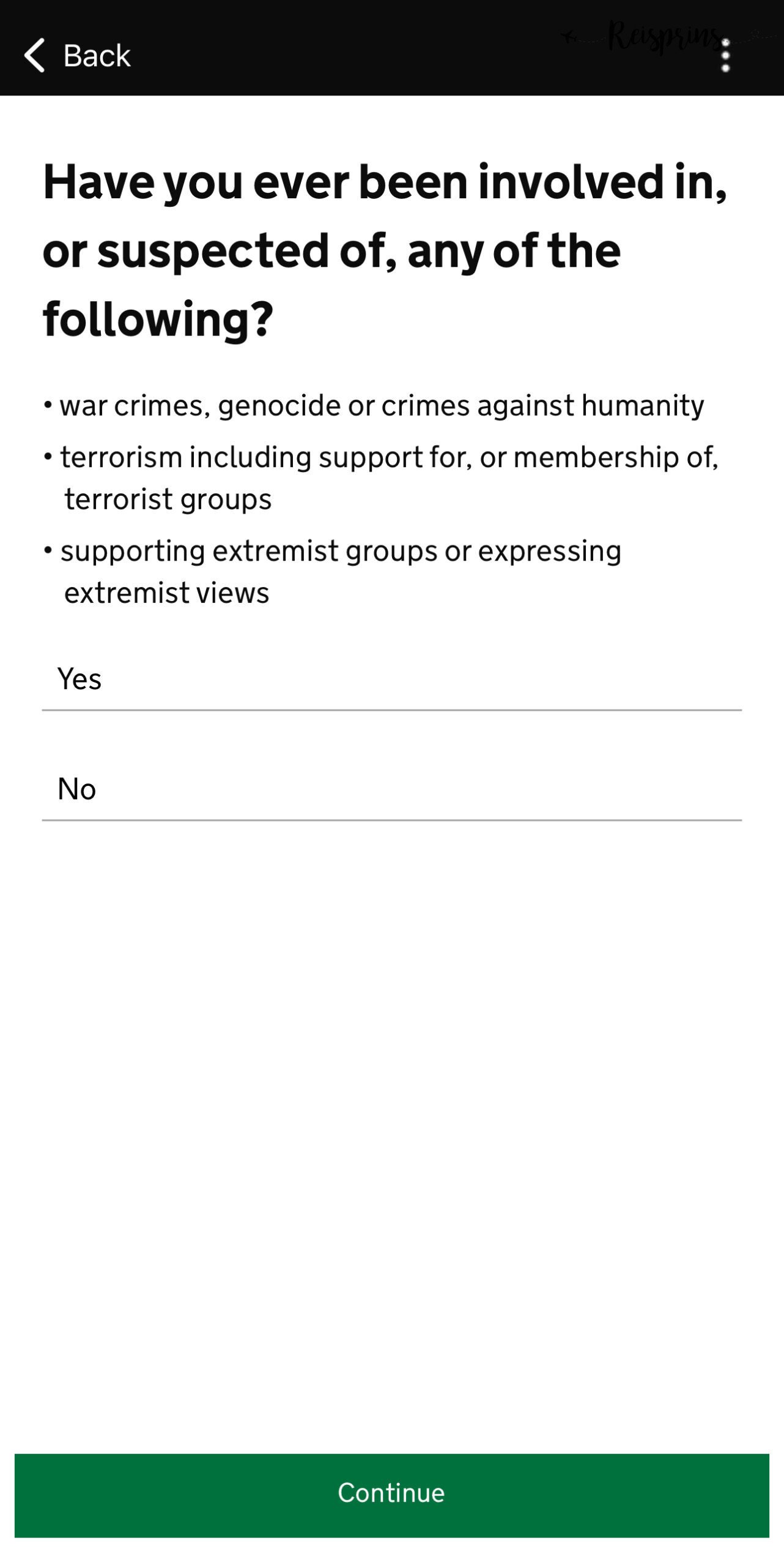 We zijn er bijna! Nadat je alle voorgaande stappen hebt gedaan moet je aangeven of je wel eens een veroordeeld bent voor een strafrechtelijk feit en klik je hierna op Continue. Hierna moet je aangeven of je ooit wel eens betrokken of verdacht ben geweest van oorlogsmisdaden, genocide of een humanitaire misdaad, terrorisme (inclusief een lidmaatschap of steun aan een terroristische beweging) of een extremistische groep steunt. Ook hierna klik je weer op Continue.