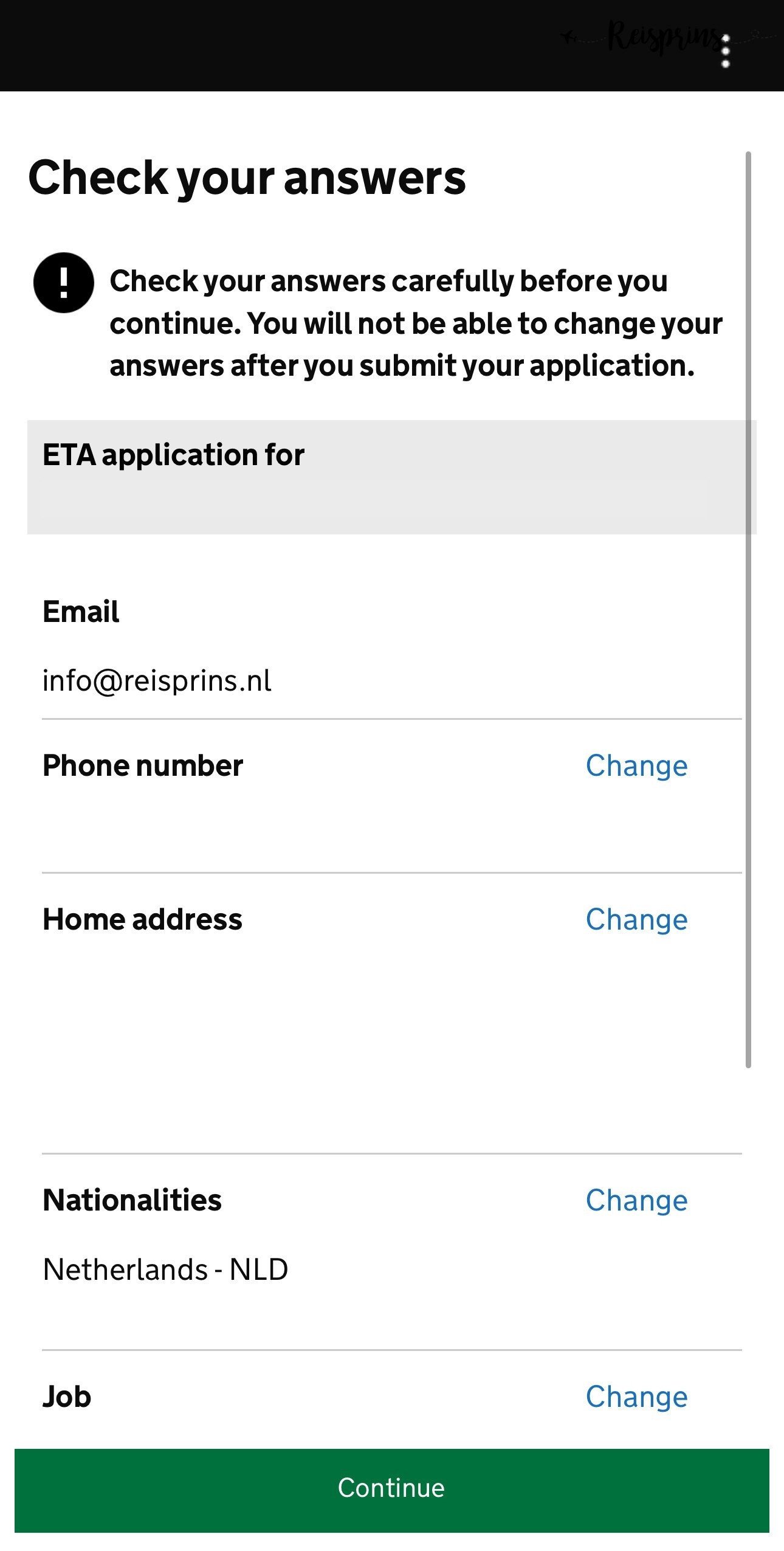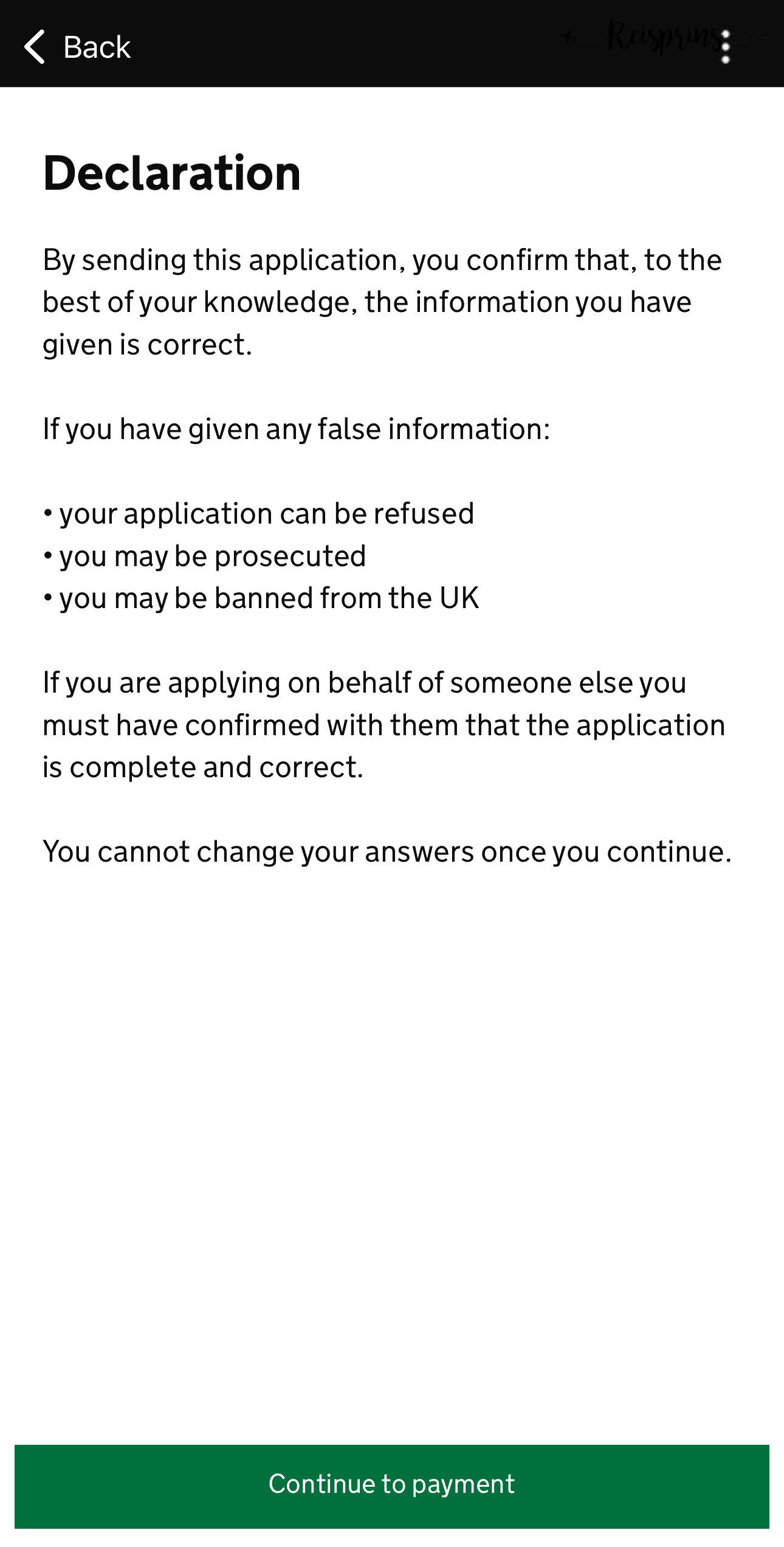 Het einde komt nu echt in zicht want het is nu tijd om al je gegeven antwoorden te controleren. Als alles juist is ingevuld druk je op de groene knop Continue. Vervolgens krijg je nog de mededeling te zien dat er stevige consequenties zijn wanneer je valse informatie hebt ingevoerd. Lees dit goed door en klik vervolgens op de groene knop Continue to payment.
