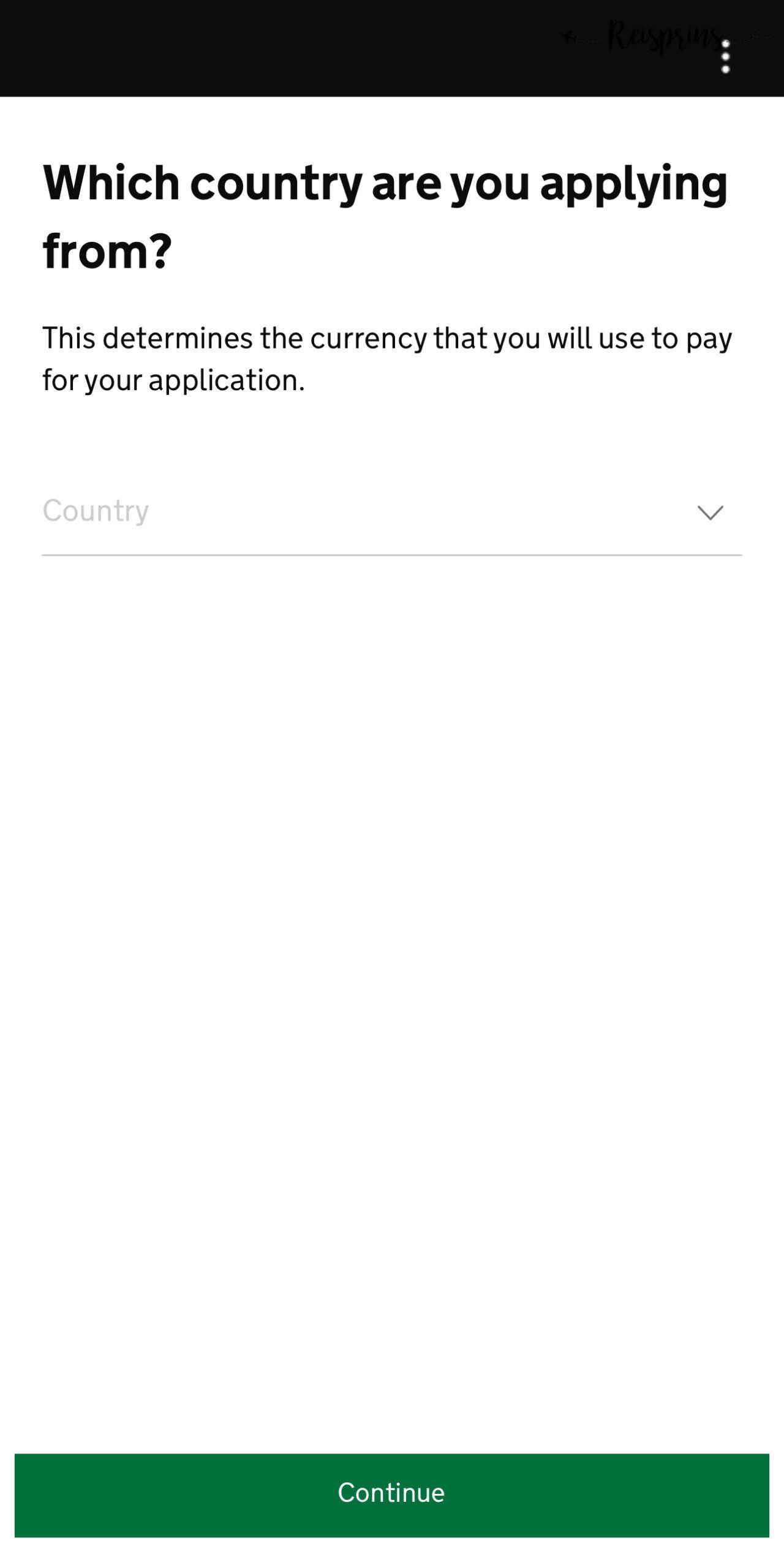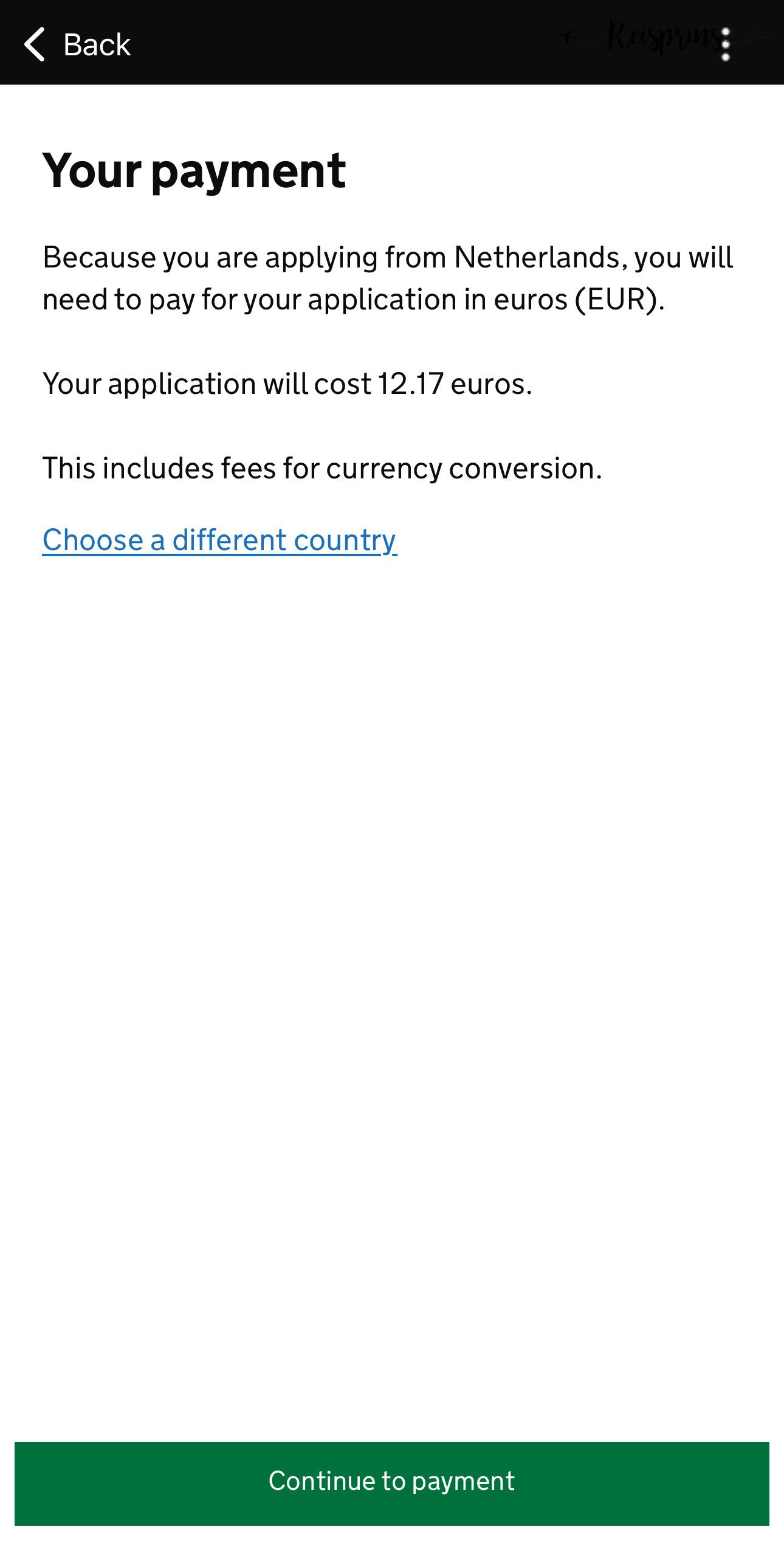 Om de methode van betaling te bepalen moet je eerst nogmaals aangeven vanuit welk land je deze aanvraag doet. Selecteer hier dus The Netherlands en klik op de groene knop Continue. Je krijgt hierna het totaalbedrag te zien wat je moet gaan betalen. Zoals je in het voorbeeld kan zien waren de kosten op dit moment €12,17. Dit bedrag is uiteraard afhankelijk van de huidige wisselkoers van de Britse Pond. Klik op Continue to payment.